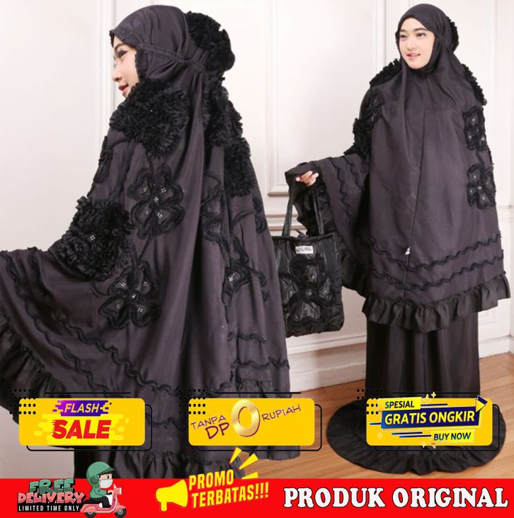 PROMO MUKENA DEWASA JUMBO KATUN MICRO GAISANI PUTIH RENDA TIMBUL PLUS TAS - HITAM