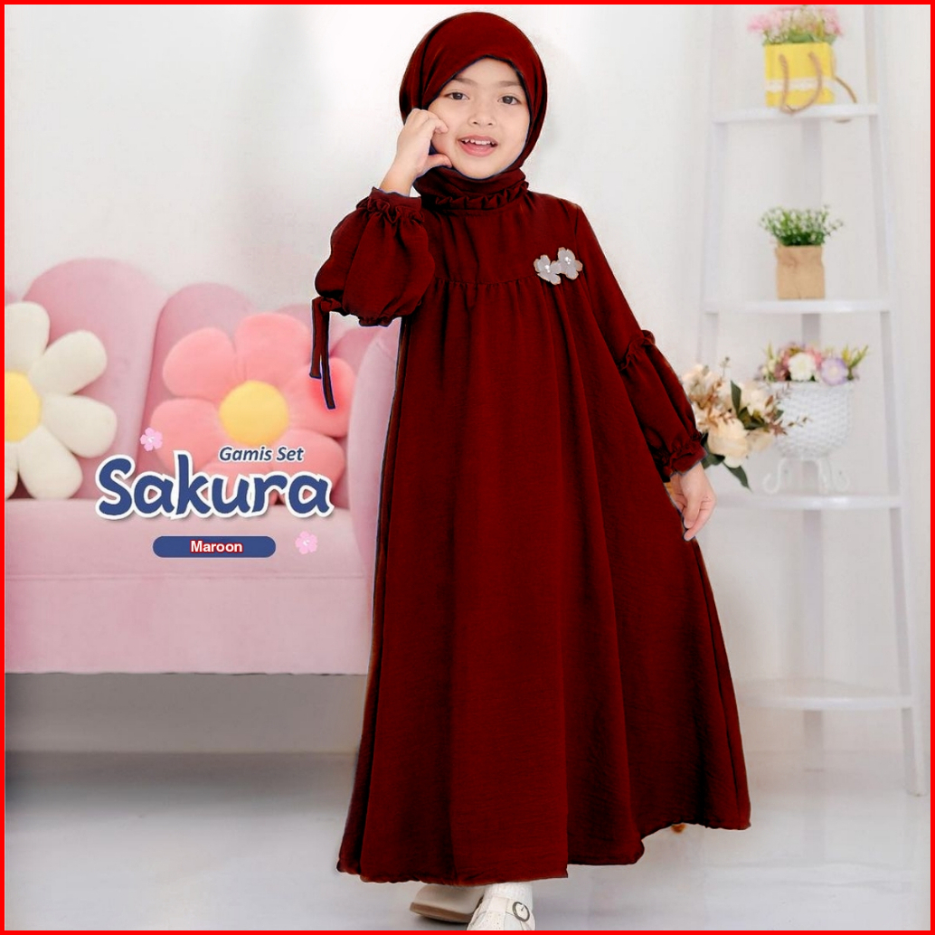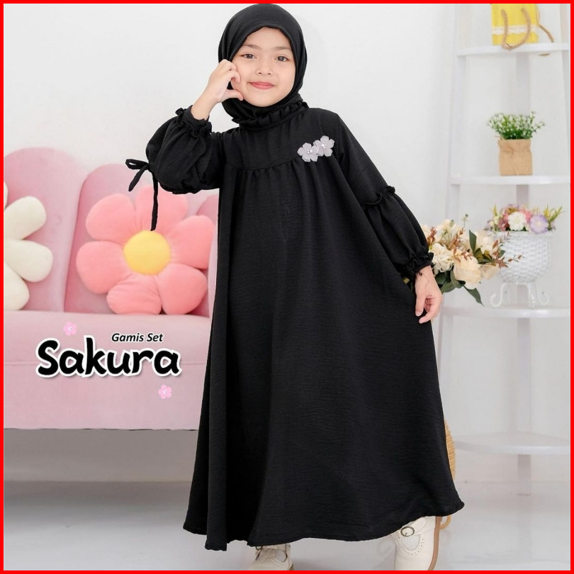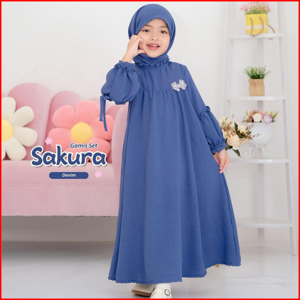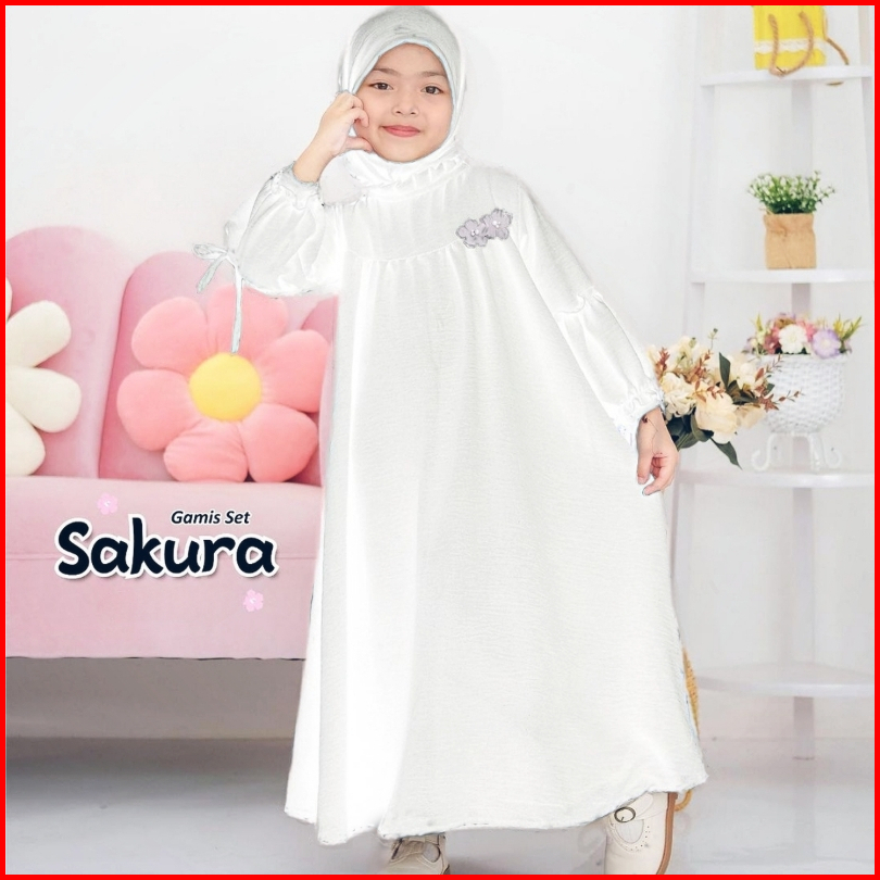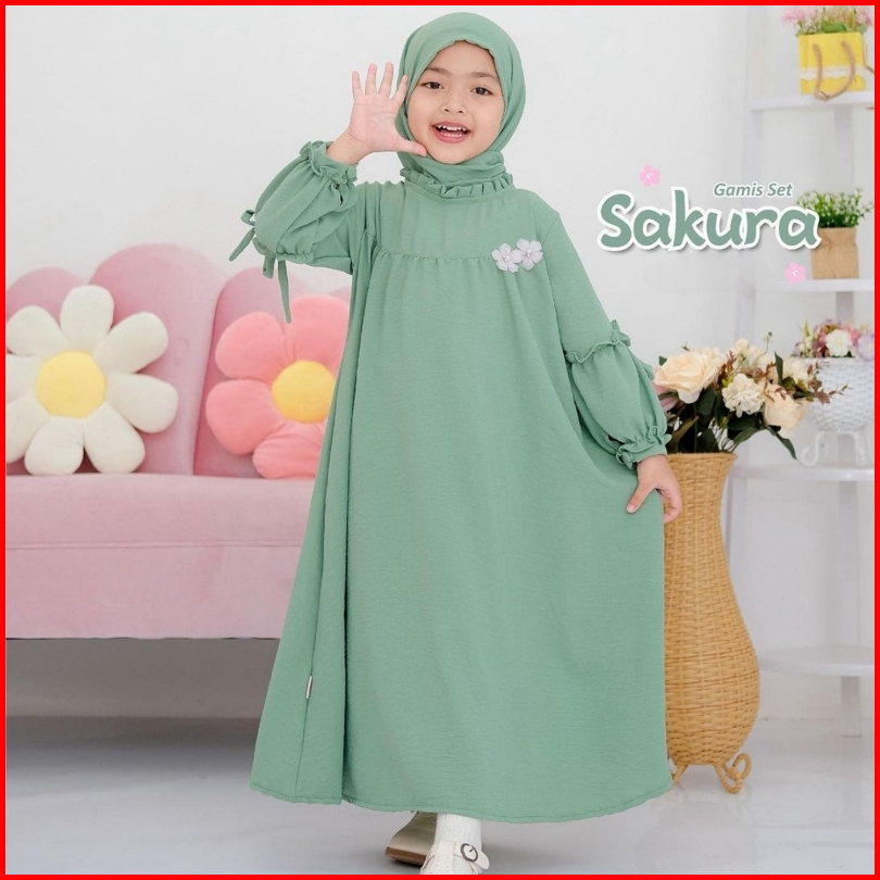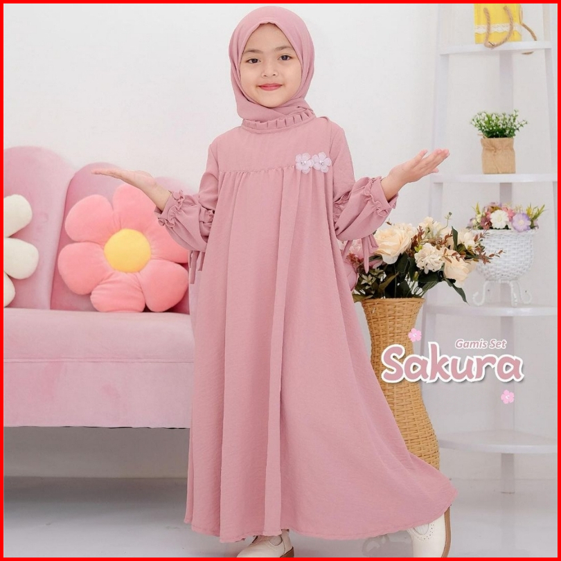 Gamis Anak Sakura Crinkle Airflow Free Pashmina 2 - 9 Tahun