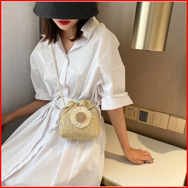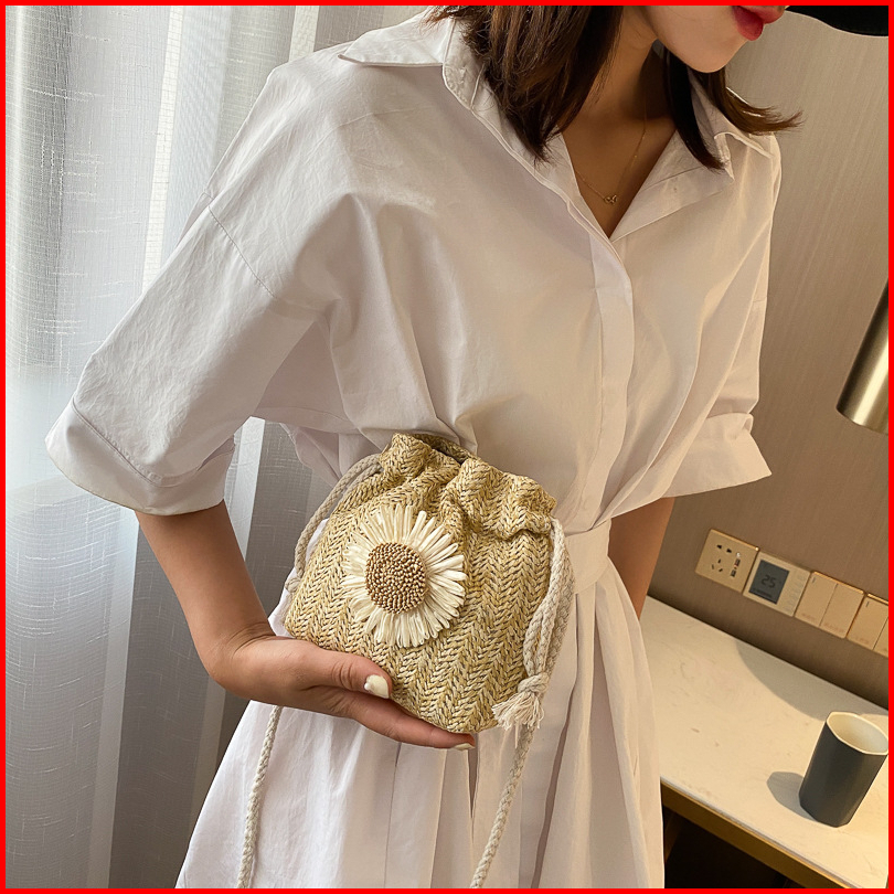 Himawari Tas Selempang Kanvas Wanita Sling Bag Hand Bag Bucket Serut Rajut Anyaman Jerami Bunga Daisy Matahari Wanita Re