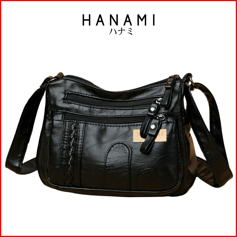 Hanami Tas Selempang Wanita Kekinian 4 Resleting Kulit Hitam Metzia Premium Sling Bag Cewek Ta506b5