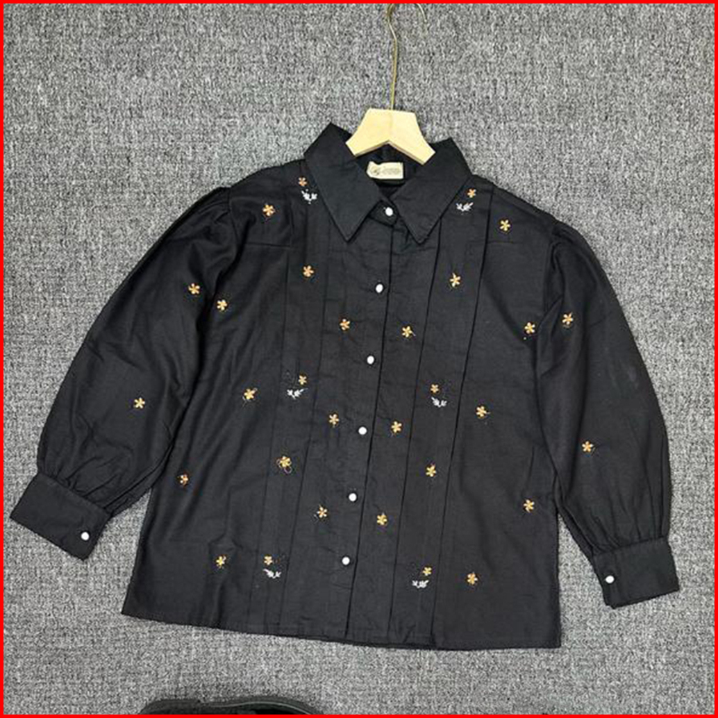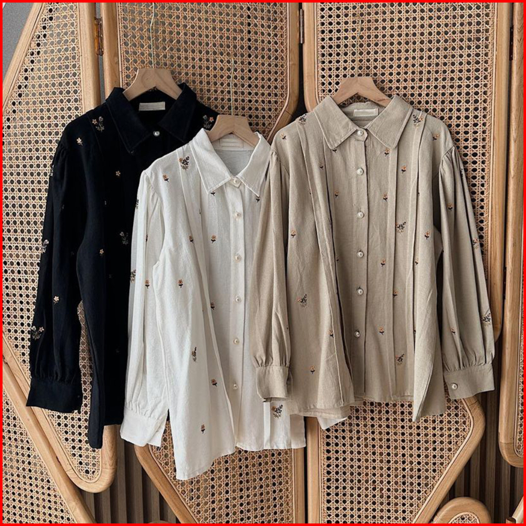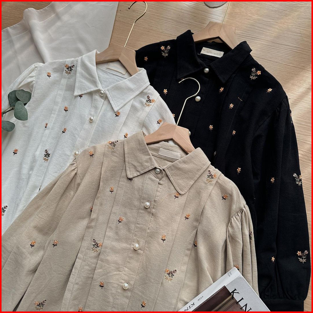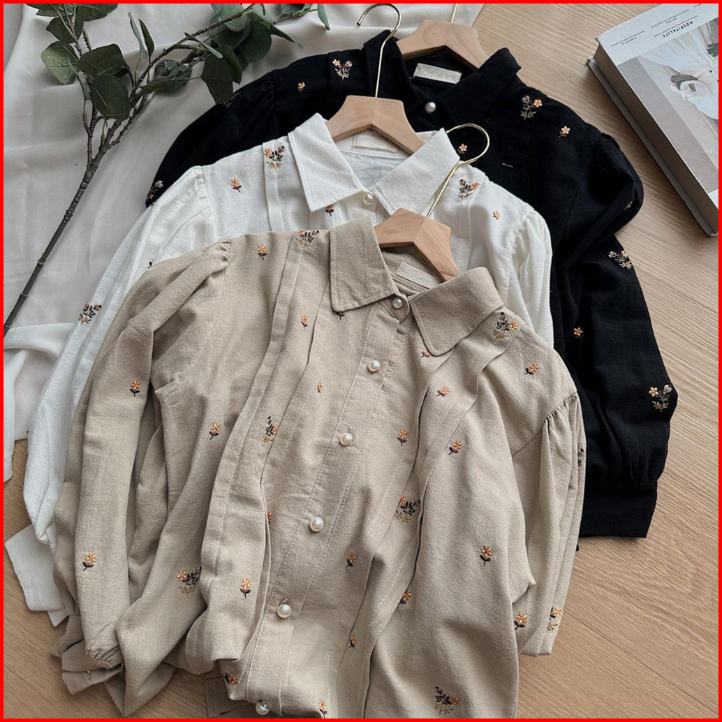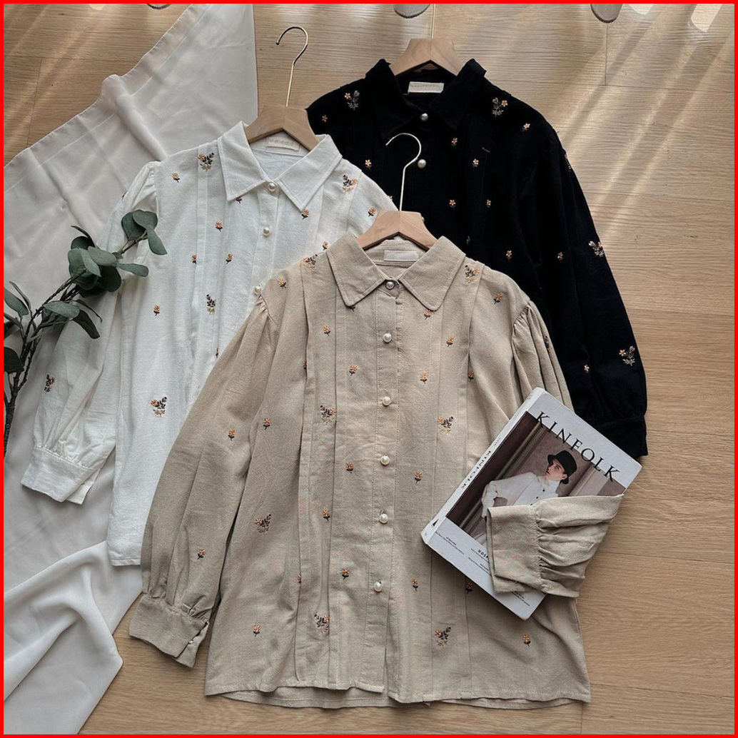 Berina Flower Kemeja Linen Wanita Lengan Panjang Korean Style Motif Bunga Bordir Modis Kekinian