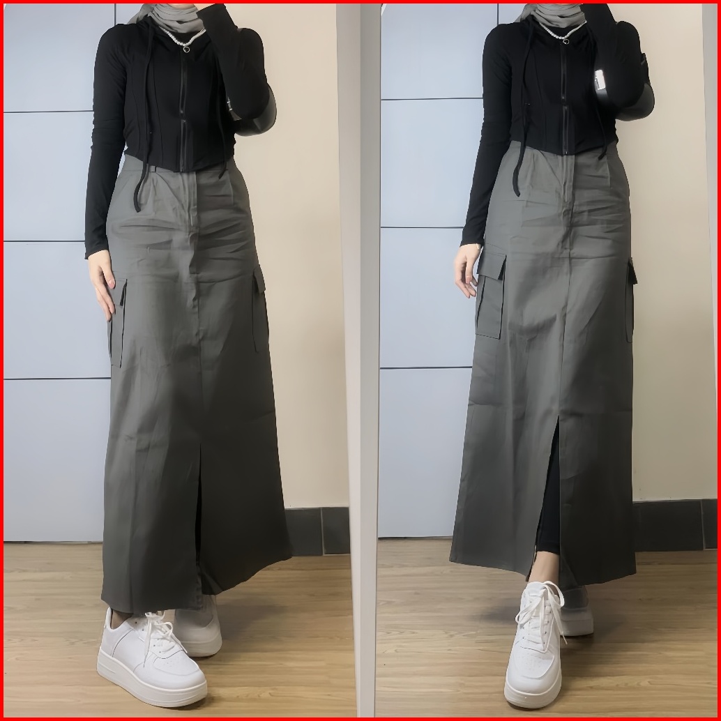 Rok Cargo Panjang Belah Tengah - Rok Kargo Twill Korean Style