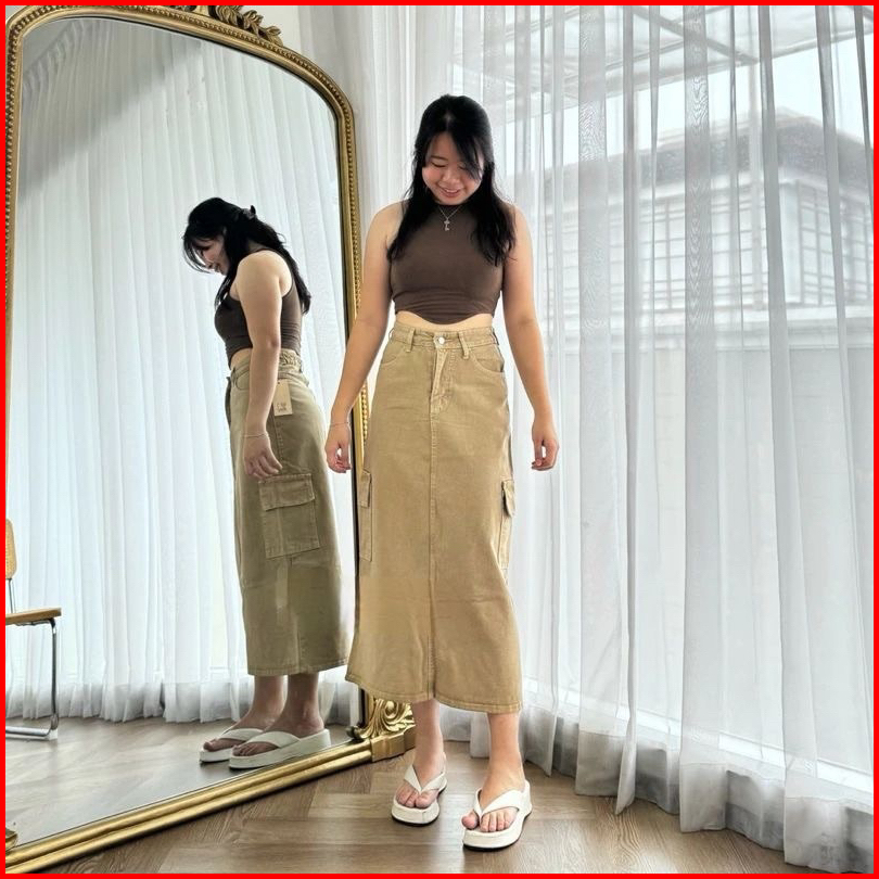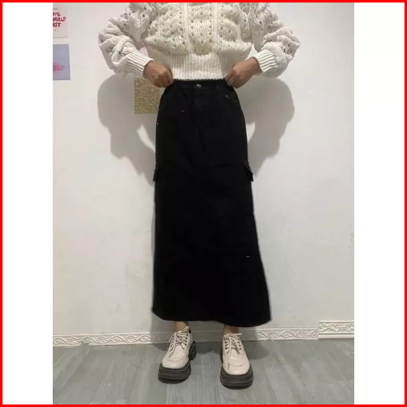 Rok Jeans Wanita Cargo Highwaist Belah Depan