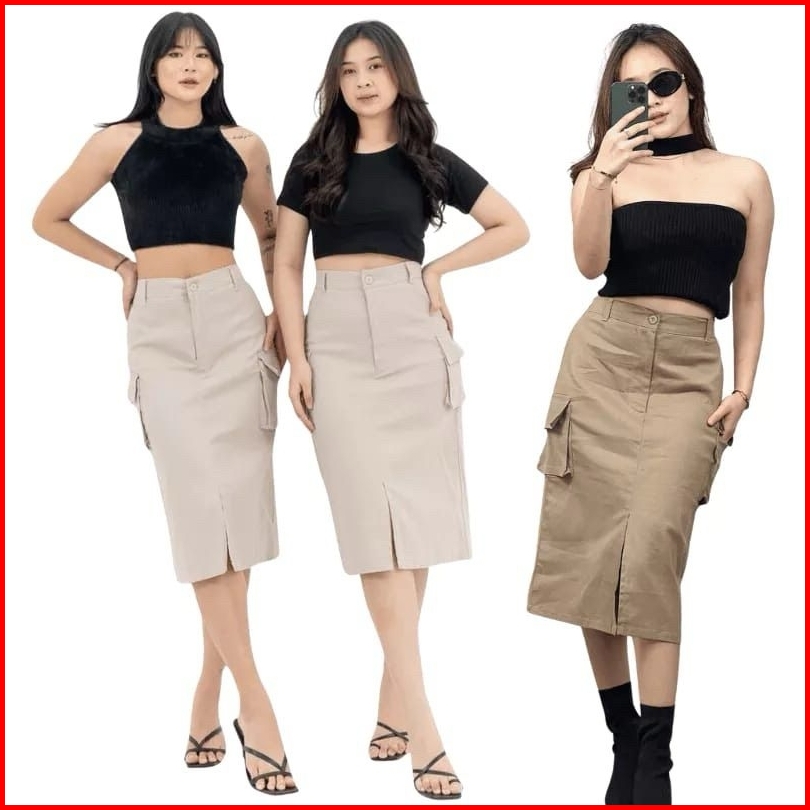 Yenny Fashions Rok Kargo Midi Cassa Skirt Cargo Highwaist 7 8 Karet Belakang
