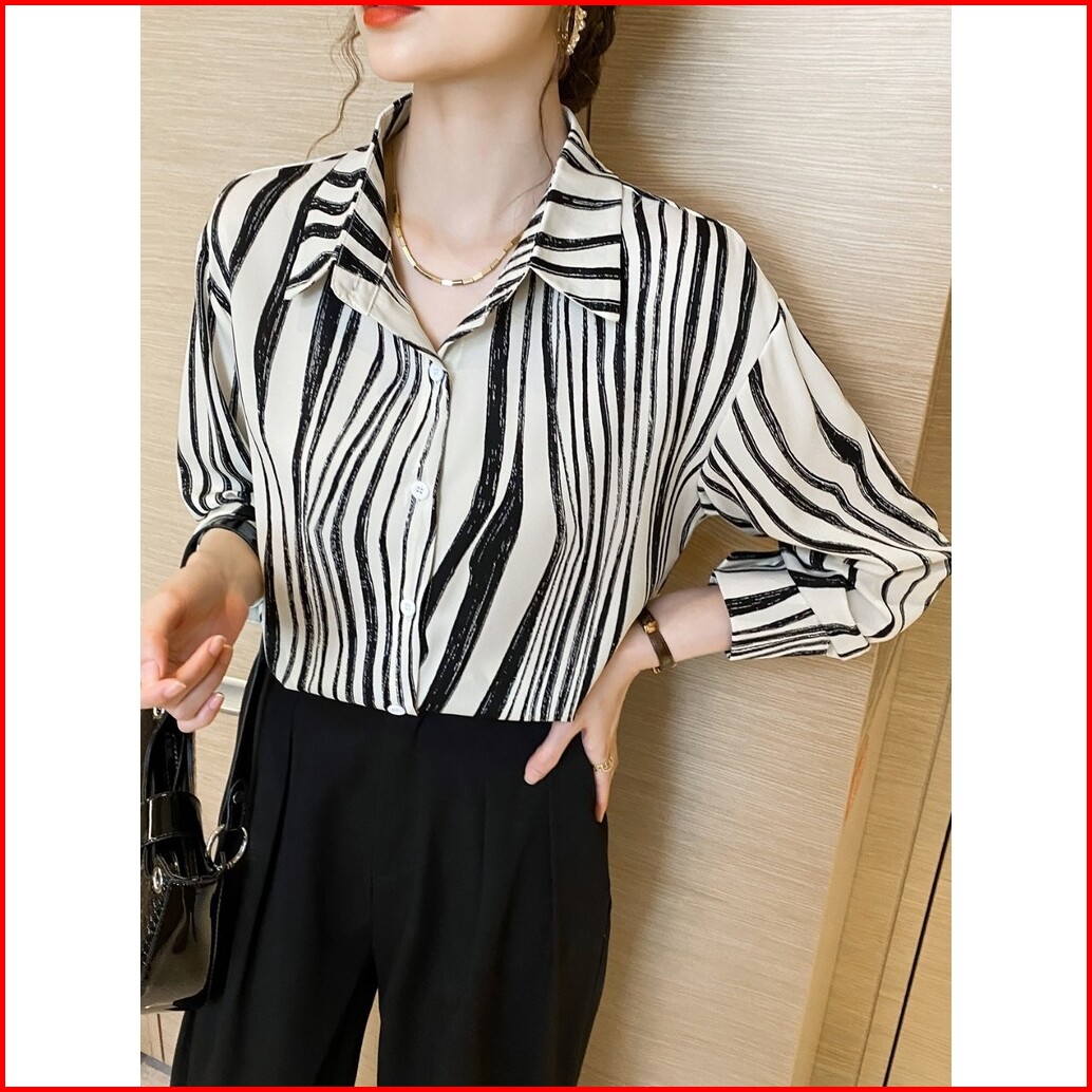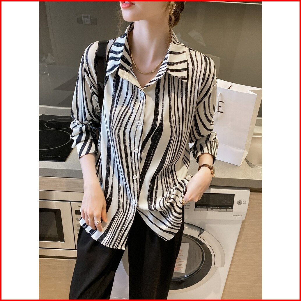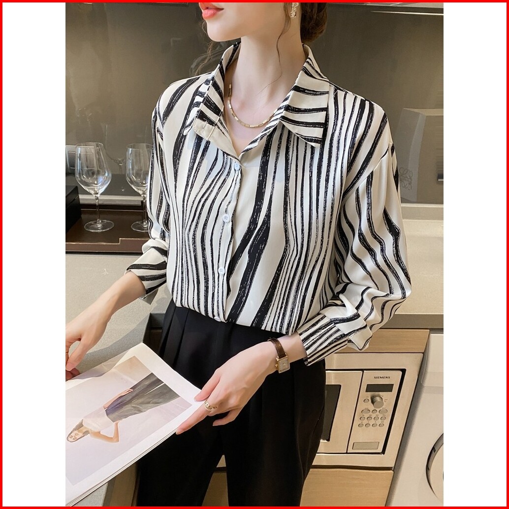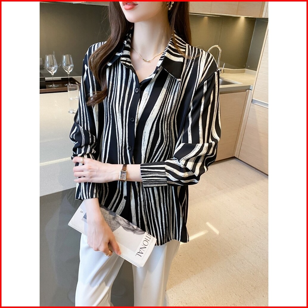 Loose Fashion Korea Chiffon Beige Black Striped Long Sleeve Shirt For Women Office Work Casual Tops