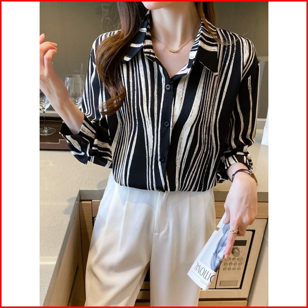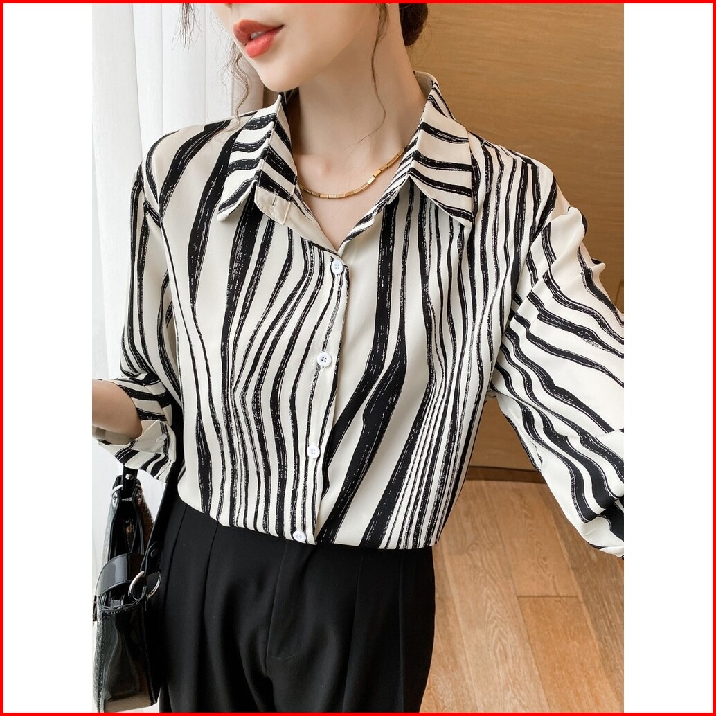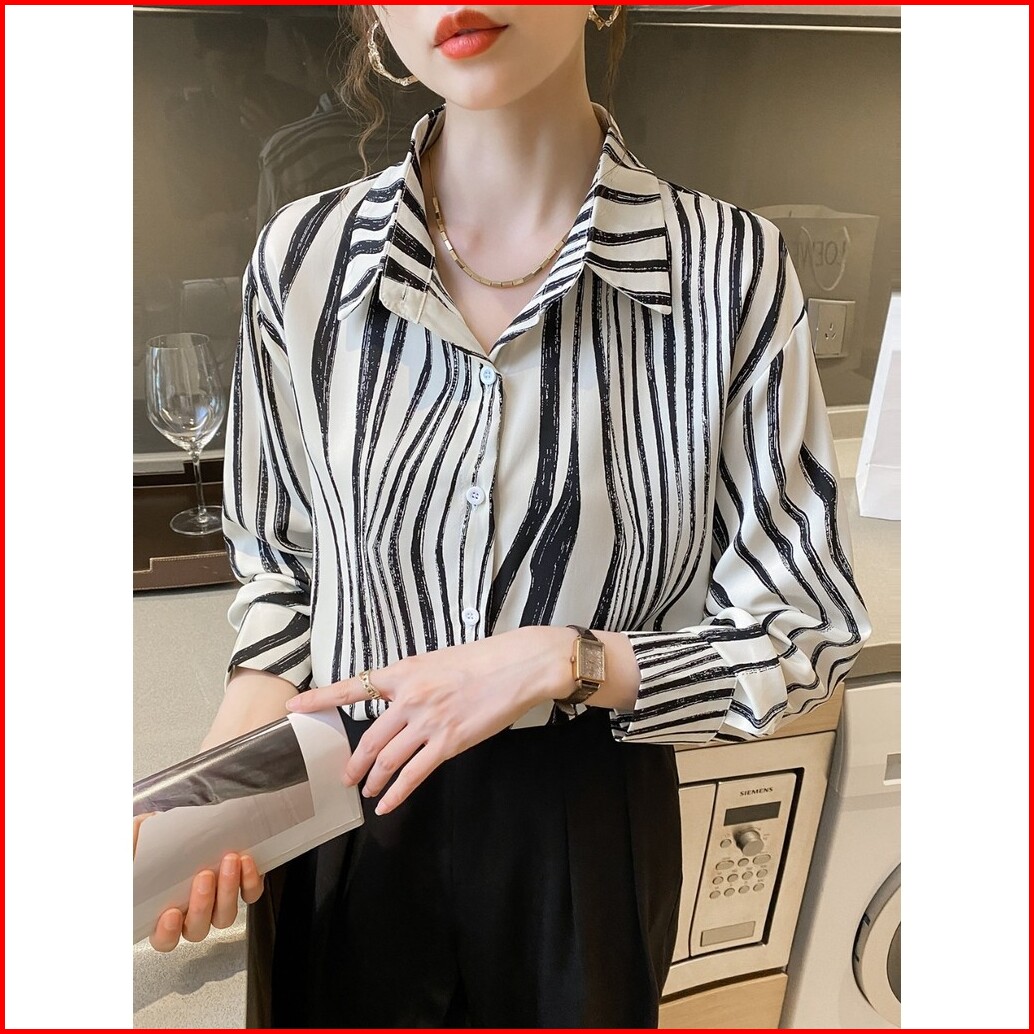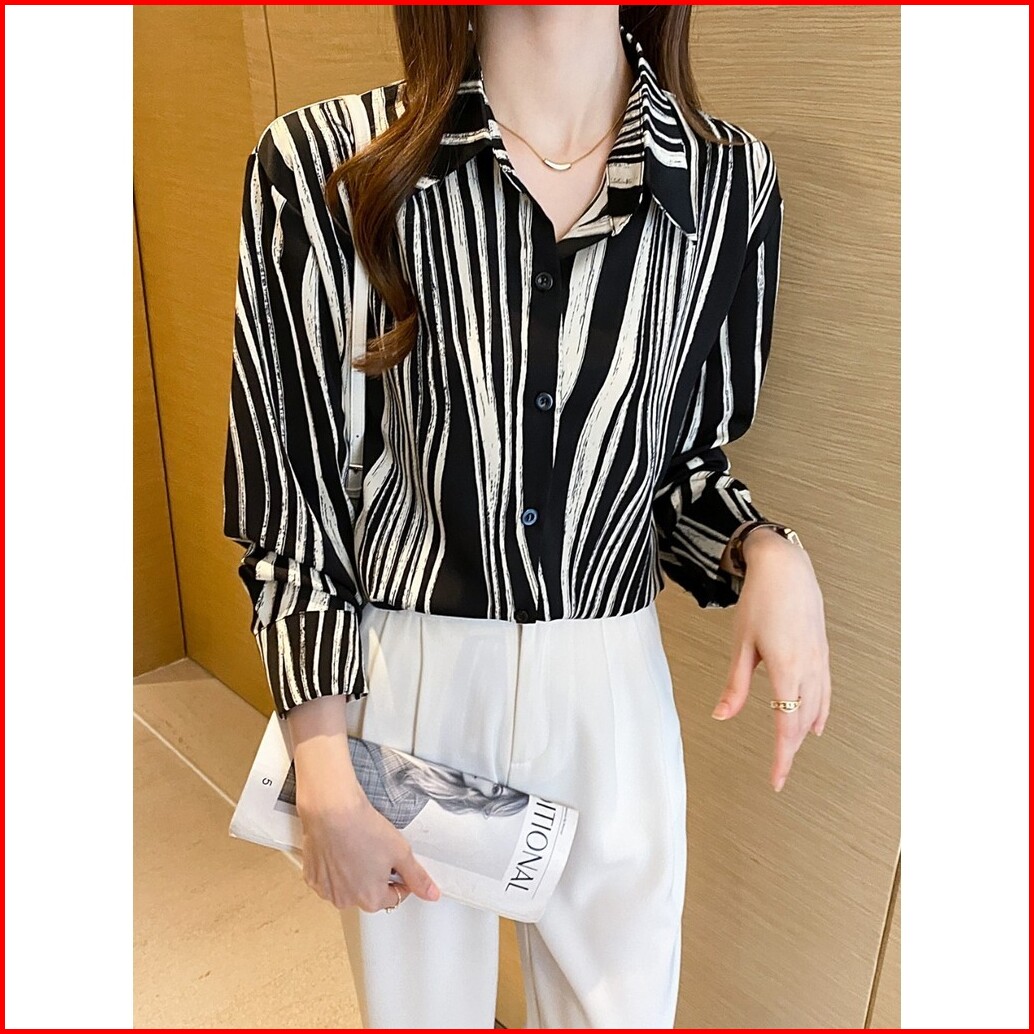 Loose Fashion Korea Chiffon Beige Black Striped Long Sleeve Shirt For Women Office Work Casual Tops