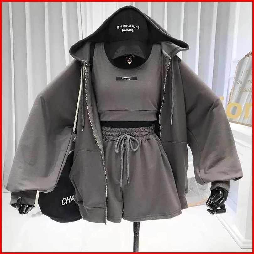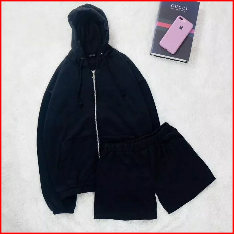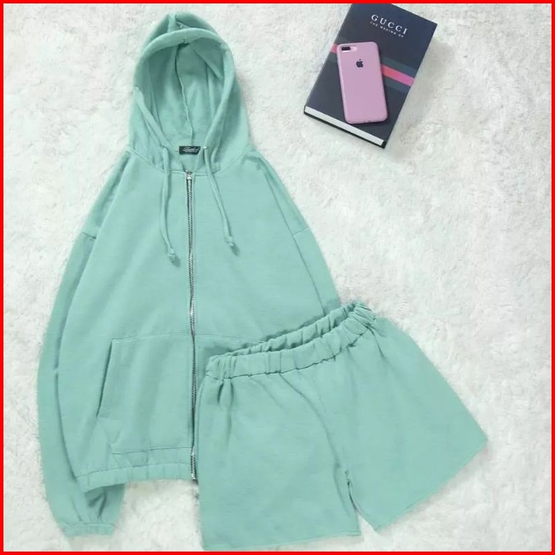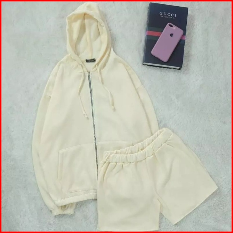 Tora One Set Hoodie Zipper Xxl Dan Celana Pendek Setelan One Set Wanita Korean Style One Set Jaket Short Pants Bahan Fle