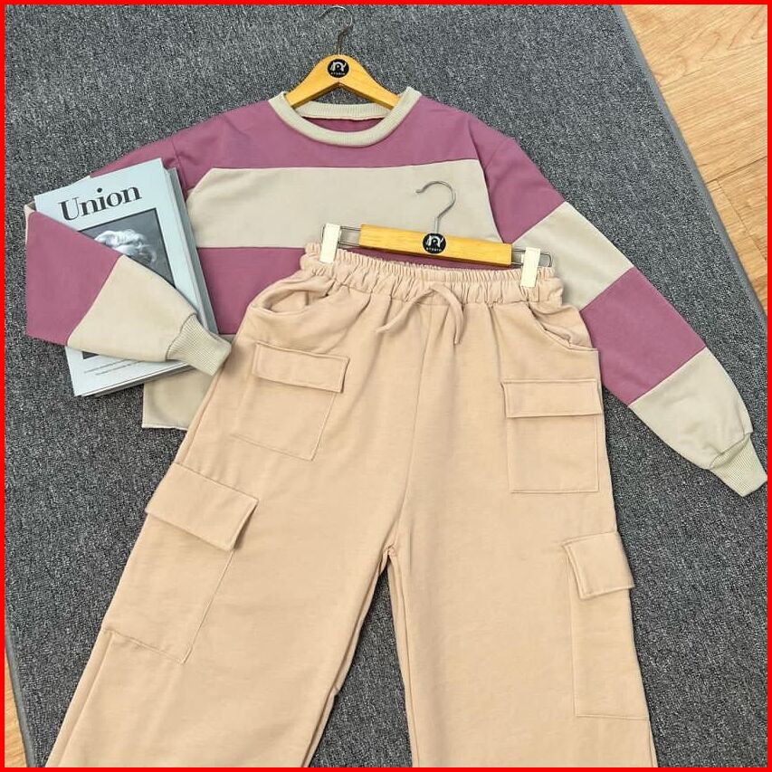 Bundling Pocky Sweater Crop Mix Jooly Pants - Pakaian Wanita Terbaru Crewneck Multicolour Mix Cargo Pants Jooly One Set