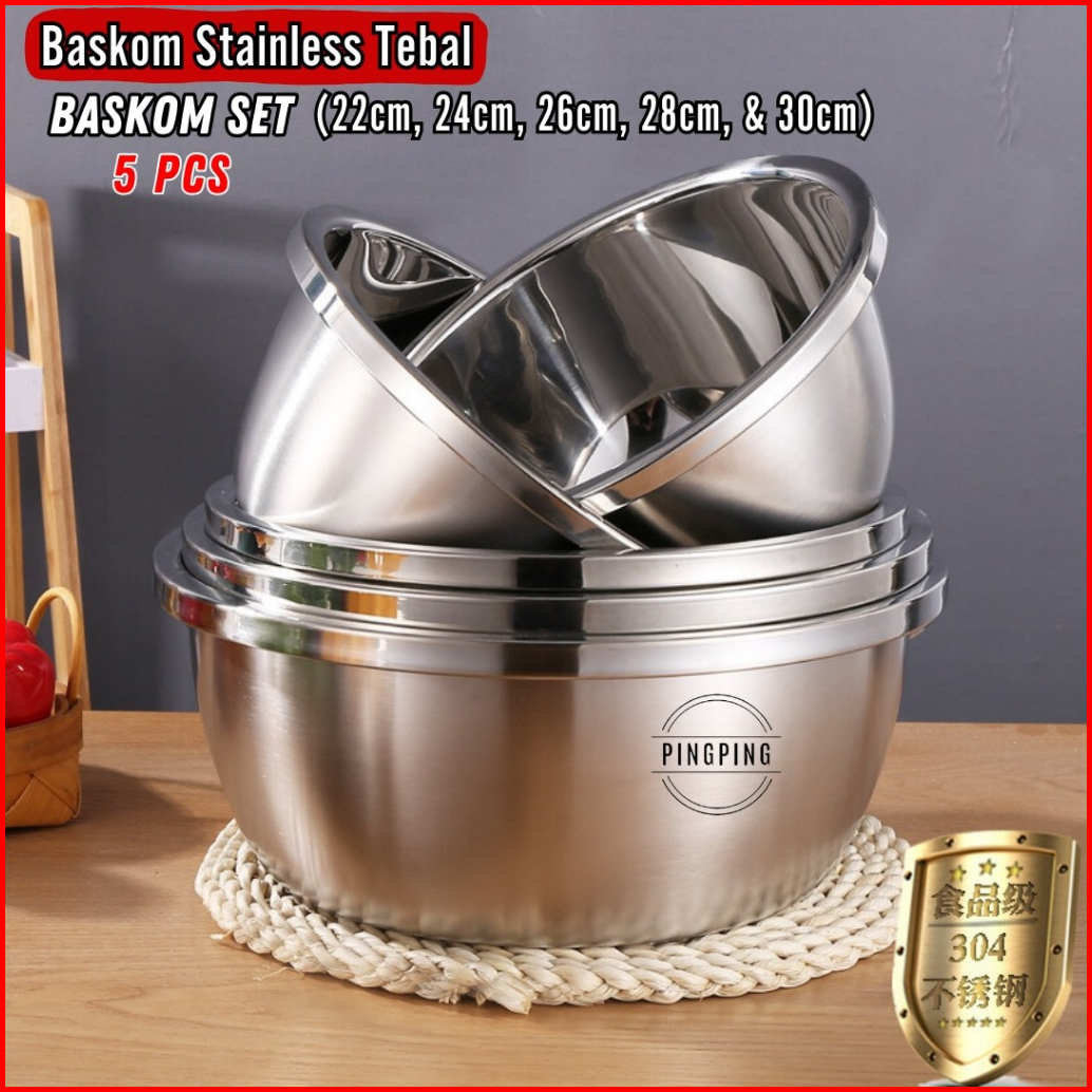Baskom Set Stainless Tebal 5in1 Wadah Cuci Beras Buah Sayur Set Baskom Mangkuk Premium Isi 5 Pcs Tebal Tinggi Stainless