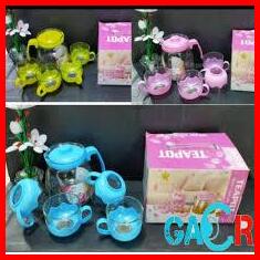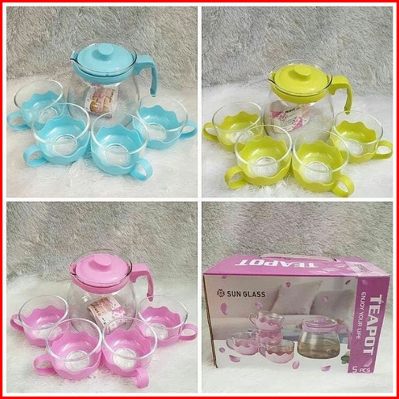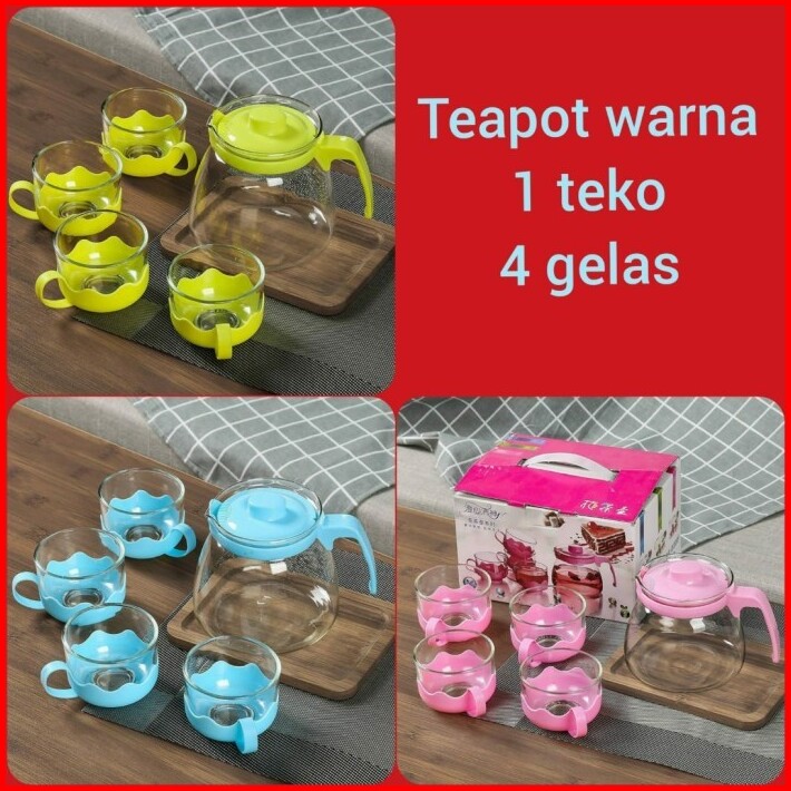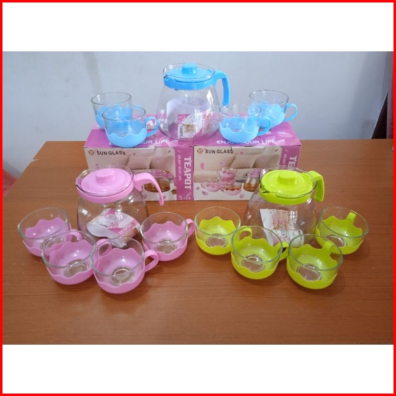 Teapot Set Kaca Warna Hijau Pink Biru