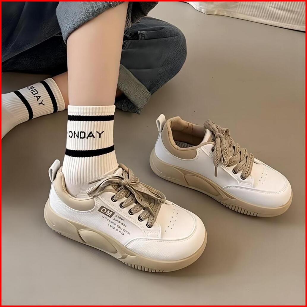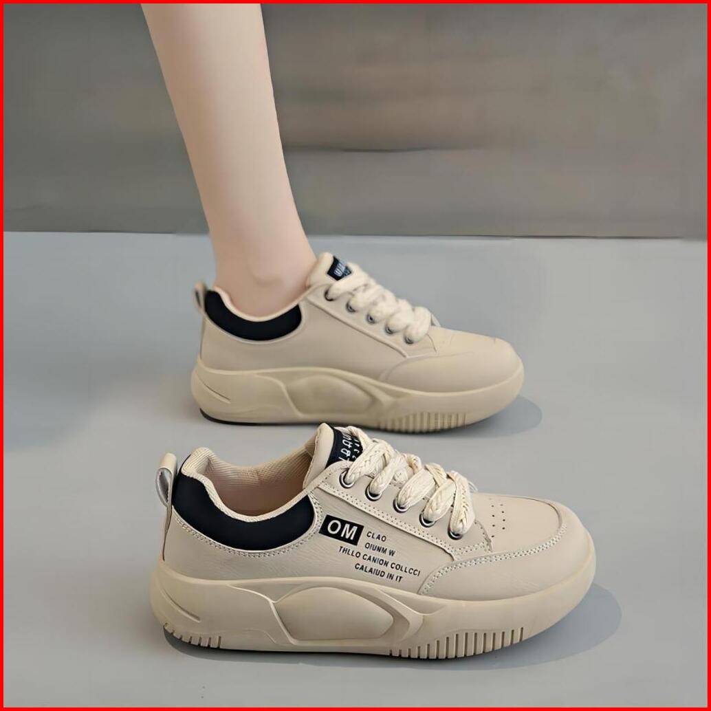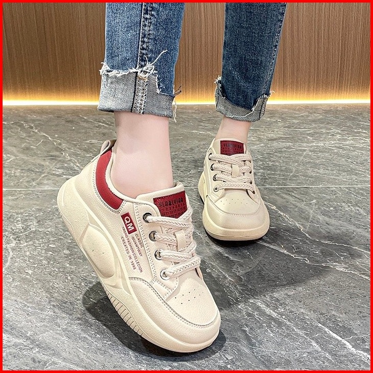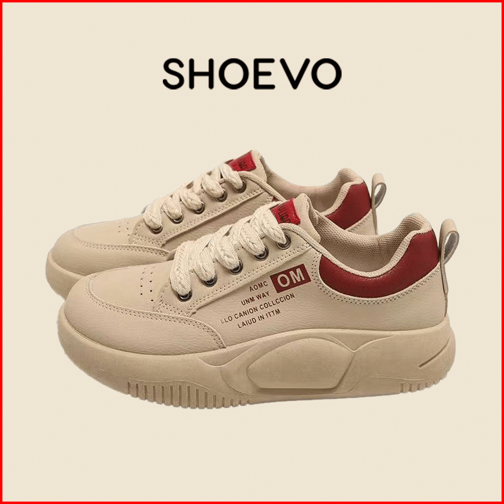 Shoevo Sneakers Olahraga Kasual Berkas Sol Tebal Berujung Bulat Sepatu Wanita Putih Hitam Merah St086
