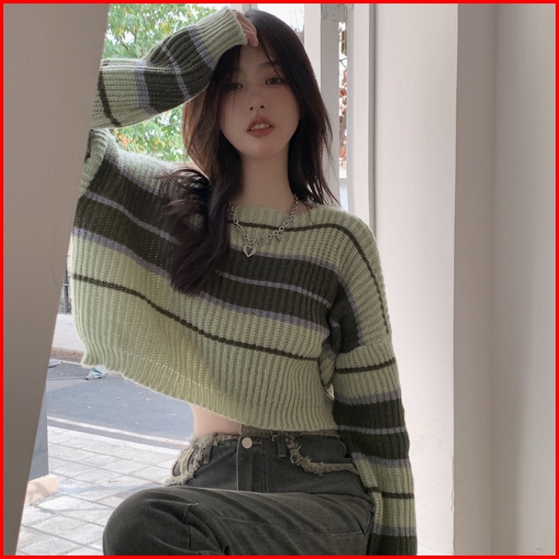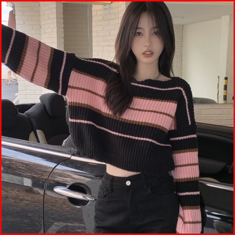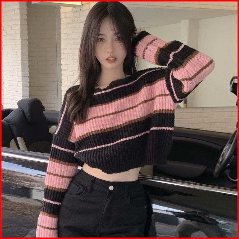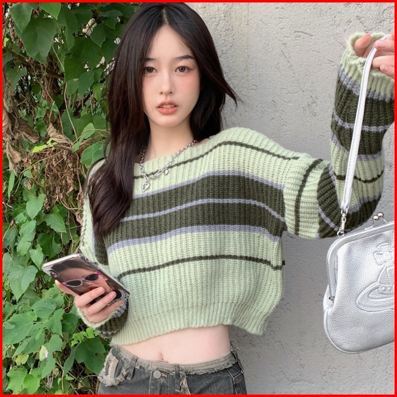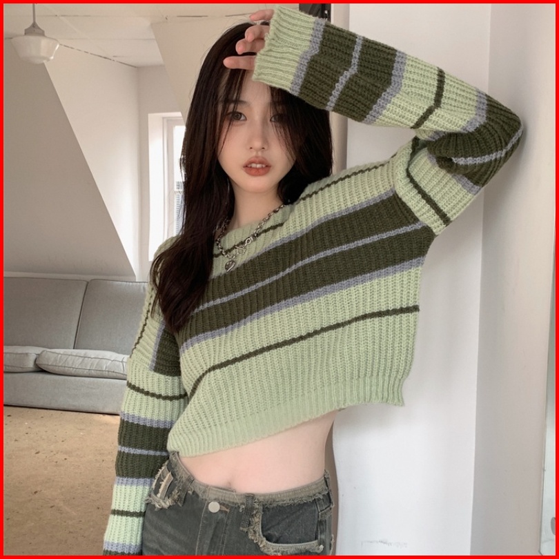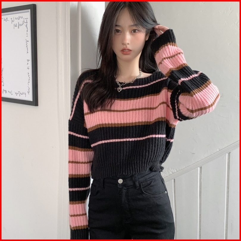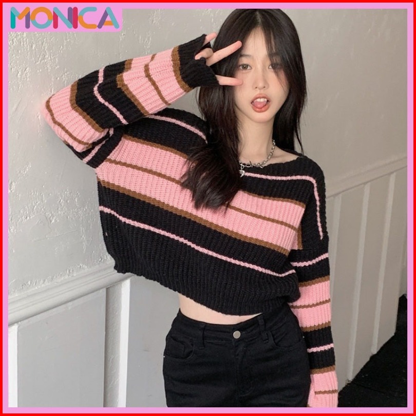 Monica Gaya Korea Malas Leher Bulat Pullover Bergaris Lengan Panjang Wanita Rajutan Atasan Sweater