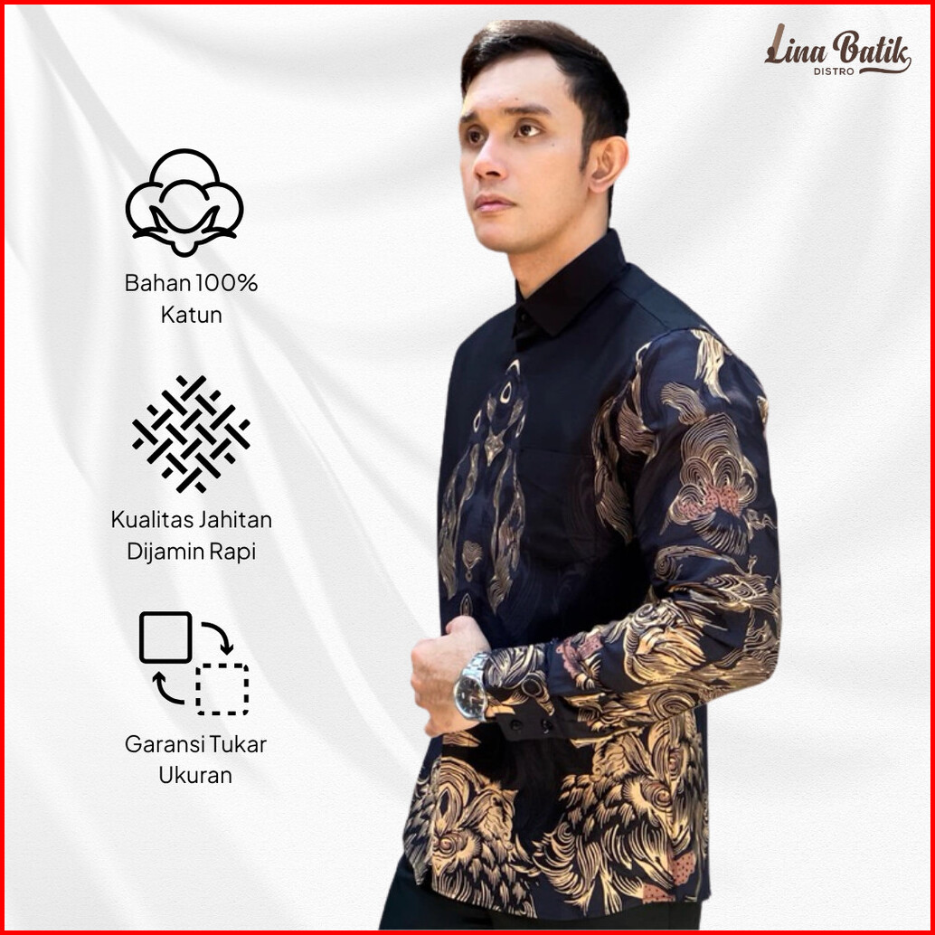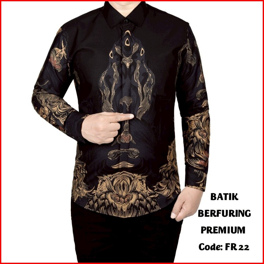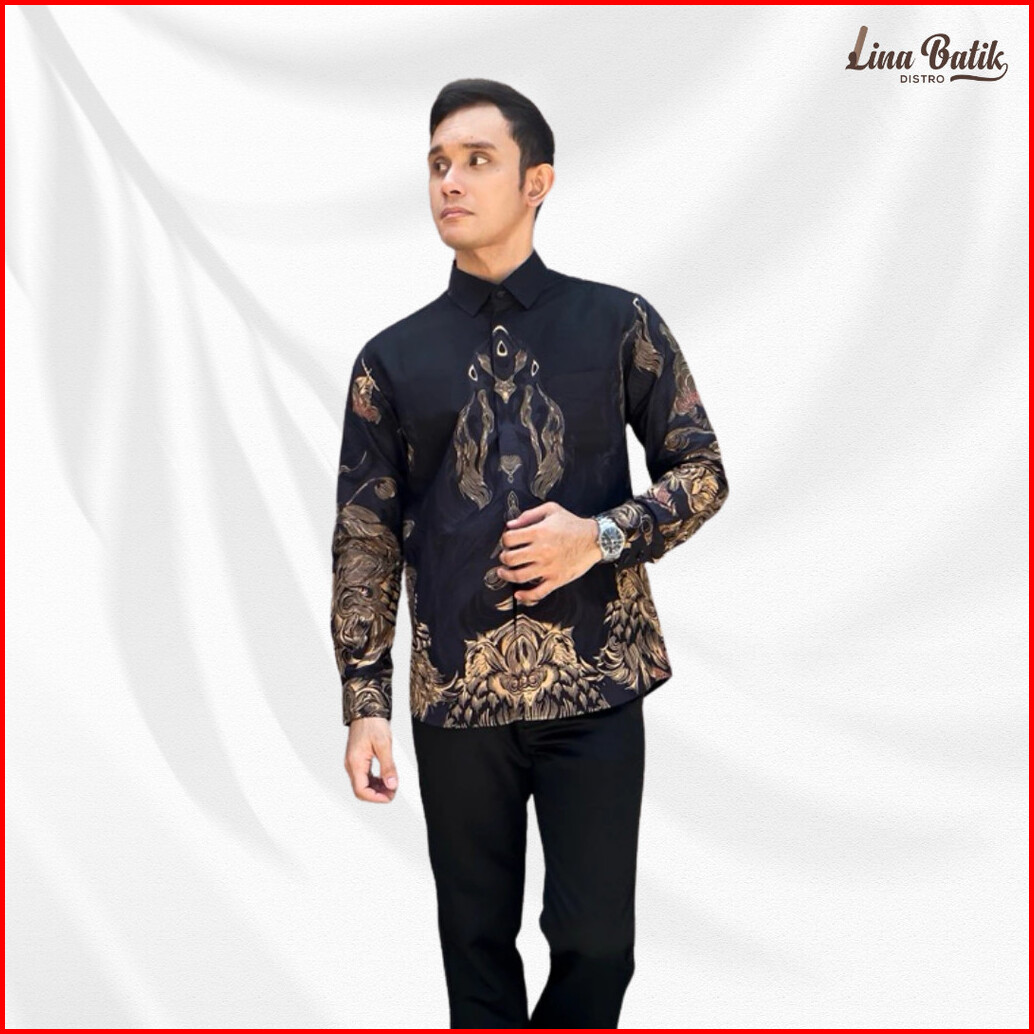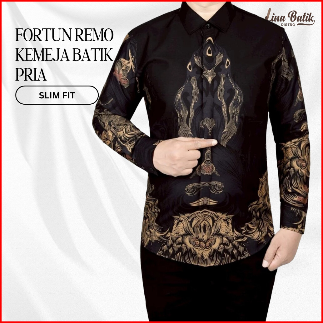 Lina Batik Distro - Fortun Remo Kemeja Batik Pria Lengan Panjang Slim Fit Modern Lapis Furing Trikot Fr 22 Hitam