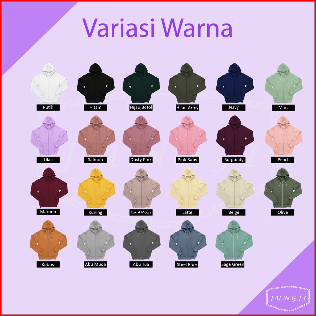 HITAM, PUTIH, BEIGE, LATTE, STEEL BLUE, SAGE GREEN, COKLAT MOCCA, SALMON, DUSTY PINK, LILAC/UNGU MUDA, RANDOM MOTIF & WARNA, MAROON, NAVY, PEACH, ABU MUDA, ABU TUA, OLIVE, MINT, BURGUNDY, HIJAU BOTOL, COKLAT KOPI, ARMY, BABY PINK, BABY BLUE, WARNA LAIN DI NOTE