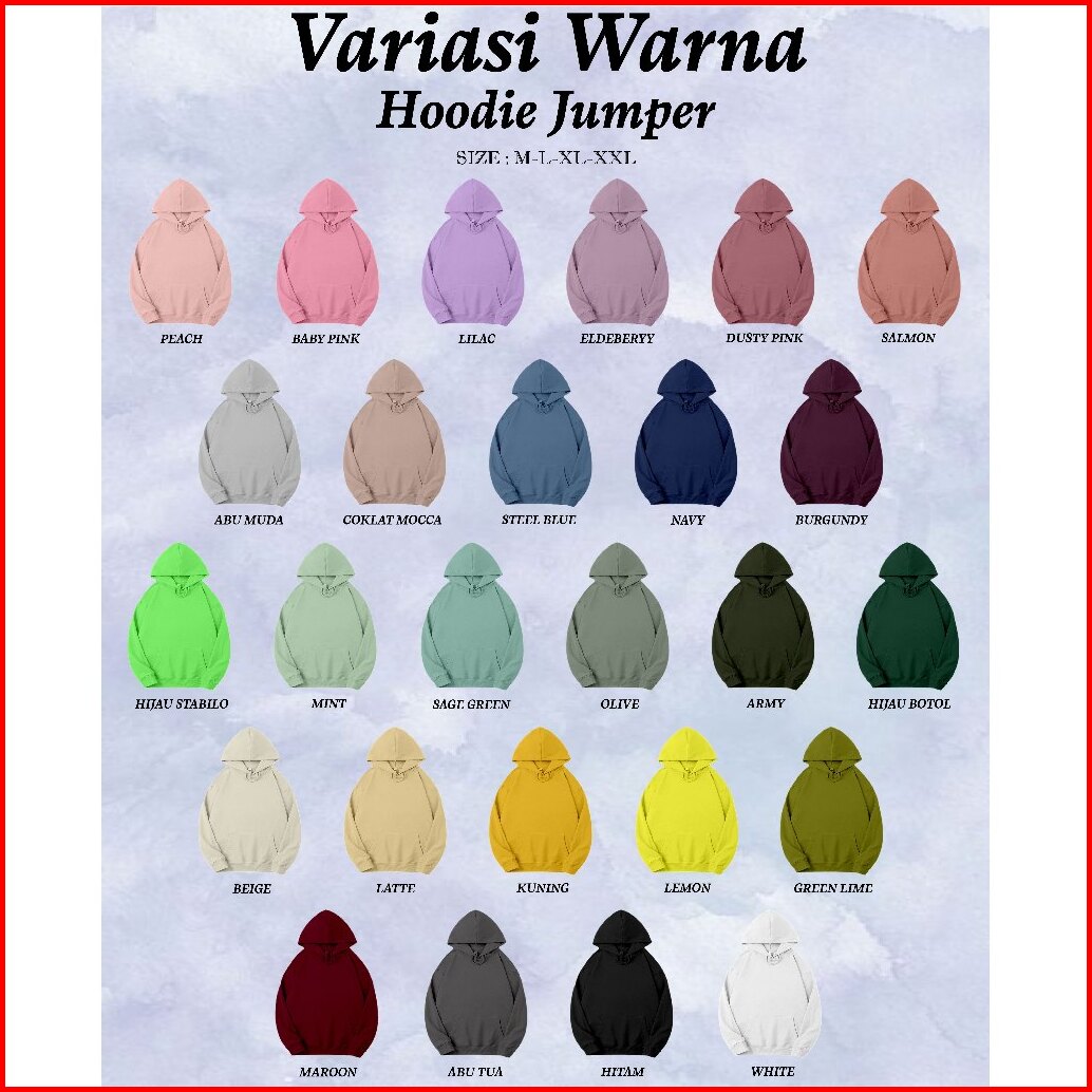 Hitam, Putih, NAVY, MAROON, ABU MUDA, HIJAU ARMY, COKLAT MOCCA, Lilac, LATTE/CREAM, Beige, BURGUNDY, SAGE GREEN, STEEL BLUE, ALDERBERRY, Mint, PEACH, Olive, GREEN LIME, LEMON, SALMON, Dusty Pink, Abu Tua, HIJAU BOTOL, WARNA LAIN DI NOTE