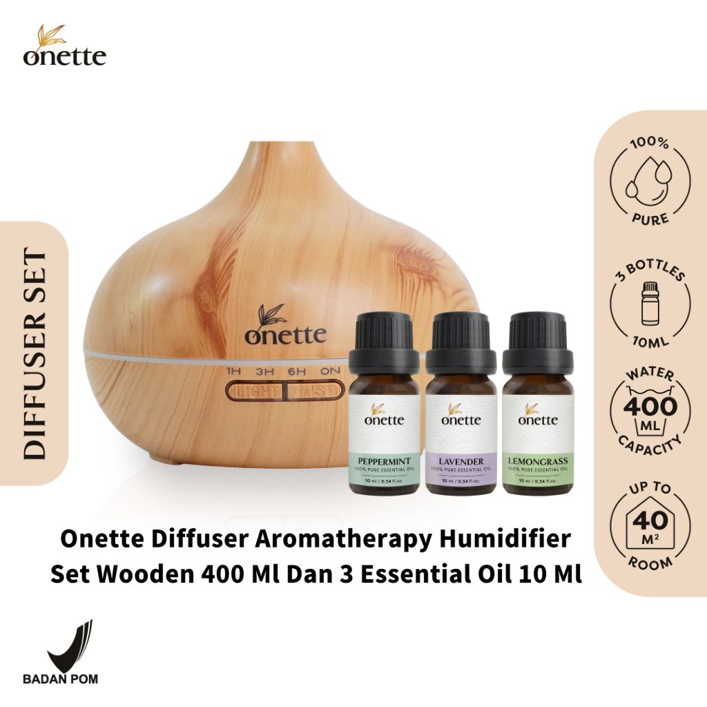 Onette Diffuser Aromatherapy Humidifier Set Wooden 400 Ml Dan 3 Essential Oil 10 Ml