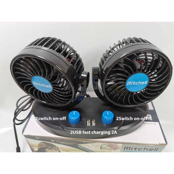 MITCHELL HX-T357 12V DC 2USB 2A + ON-OFF swing kipas mobil double fan