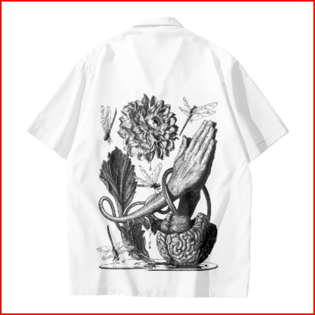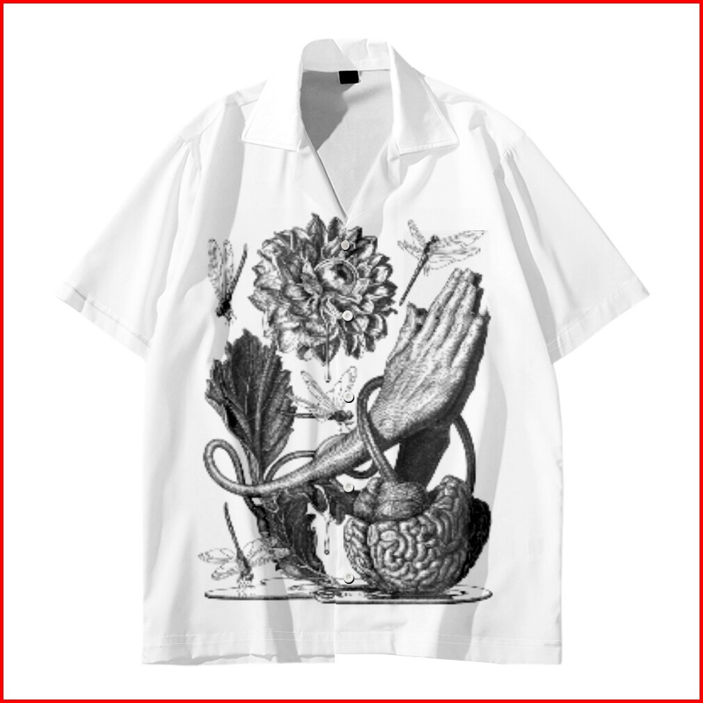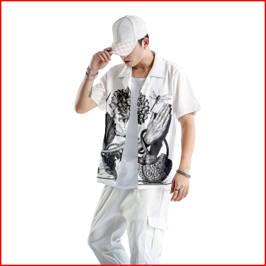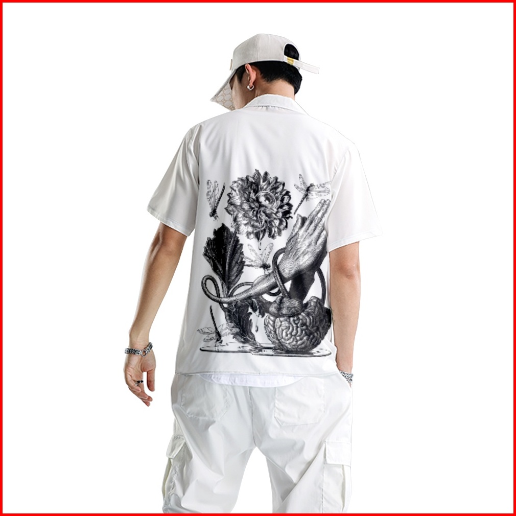 Street Fashion Casual Personalized Art Printing Kemeja Longgar Lengan Pendek Putih Pria Kelapak Kemeja Pantai Pria Jumbo