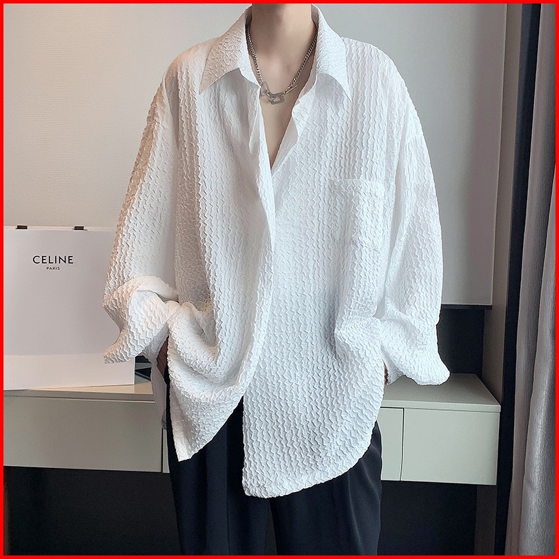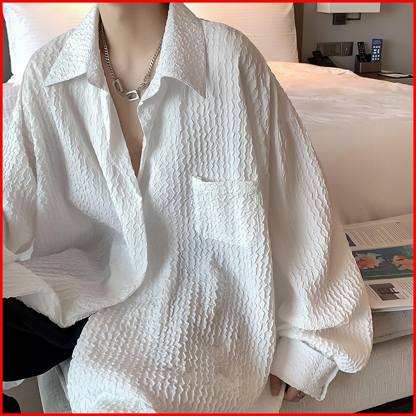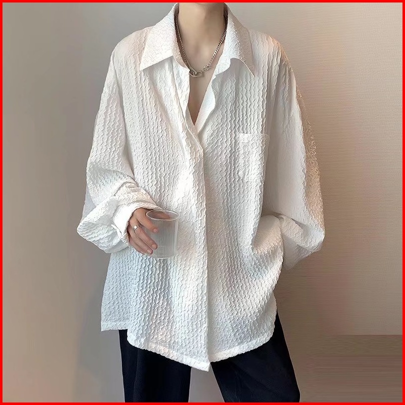 Pleated Thin Textured Summer Long Sleeve Unisex Shirt Korean Style - Kemeja Tekstur Kemeja Pleated Kemeja Kasual Semi Fo