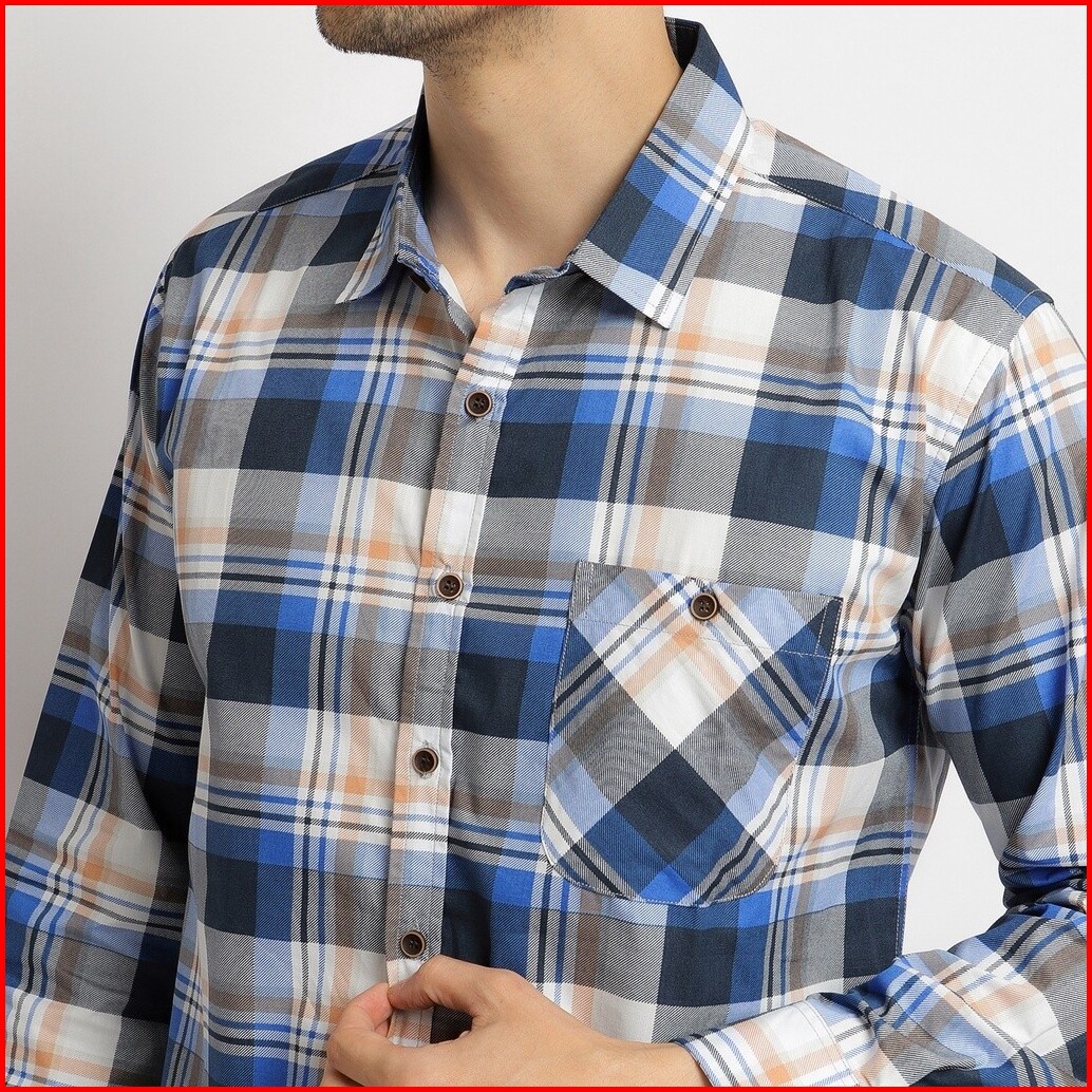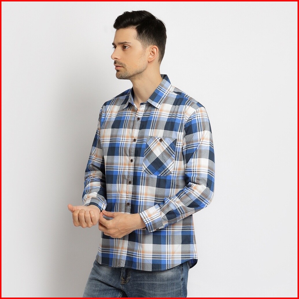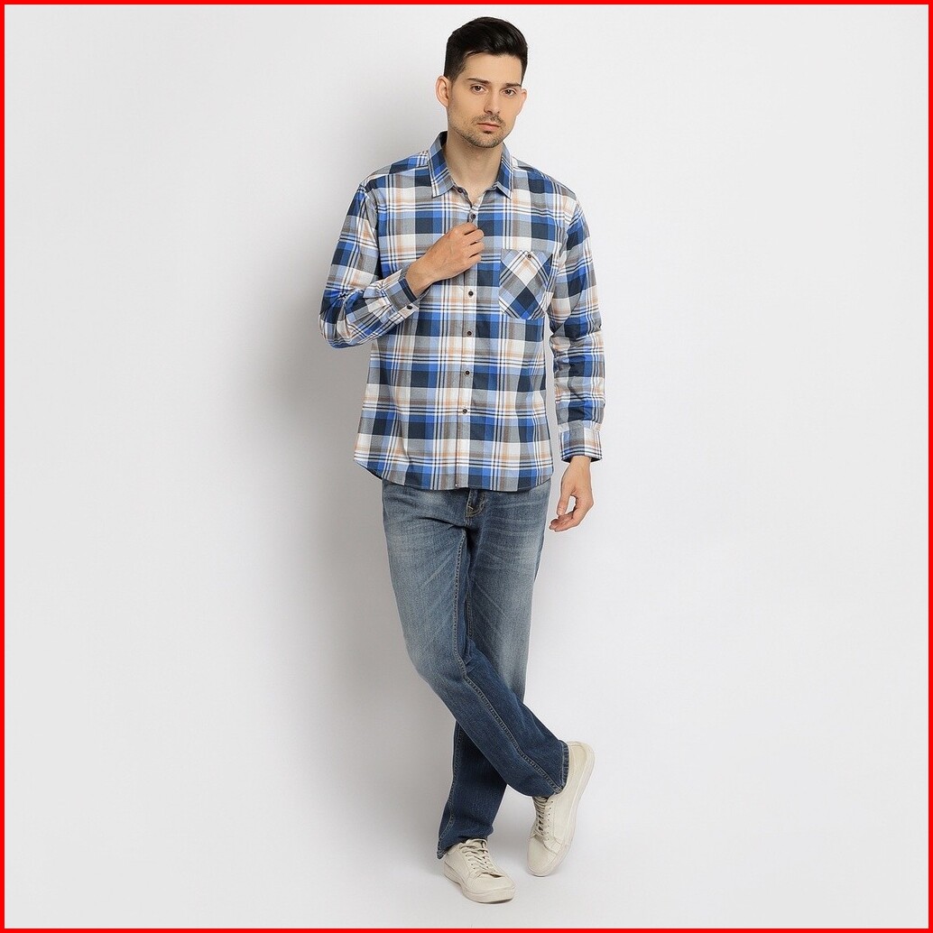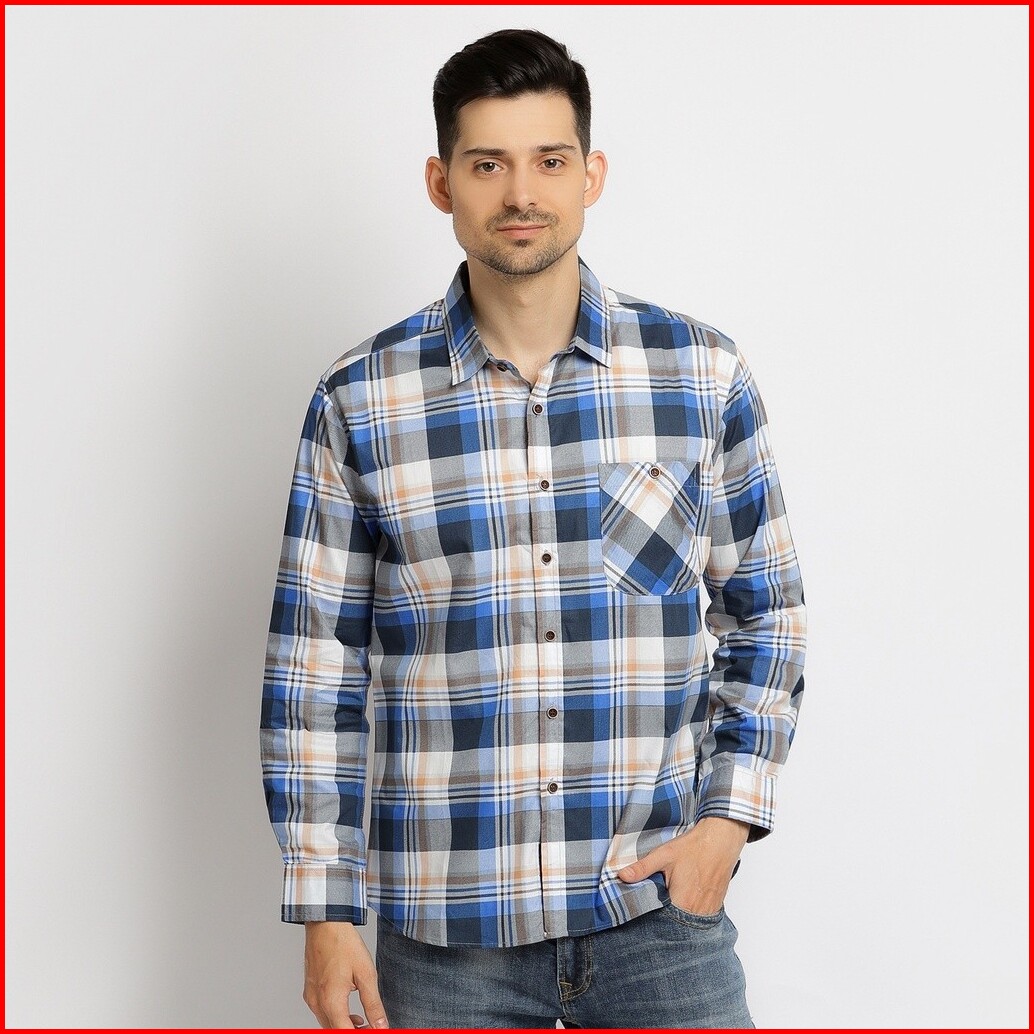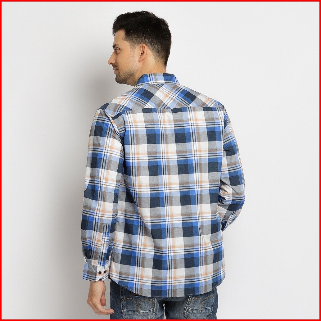 Kemeja Kotak Pria Lengan Panjang Atasan Motif Kotak Warna Biru Olr039