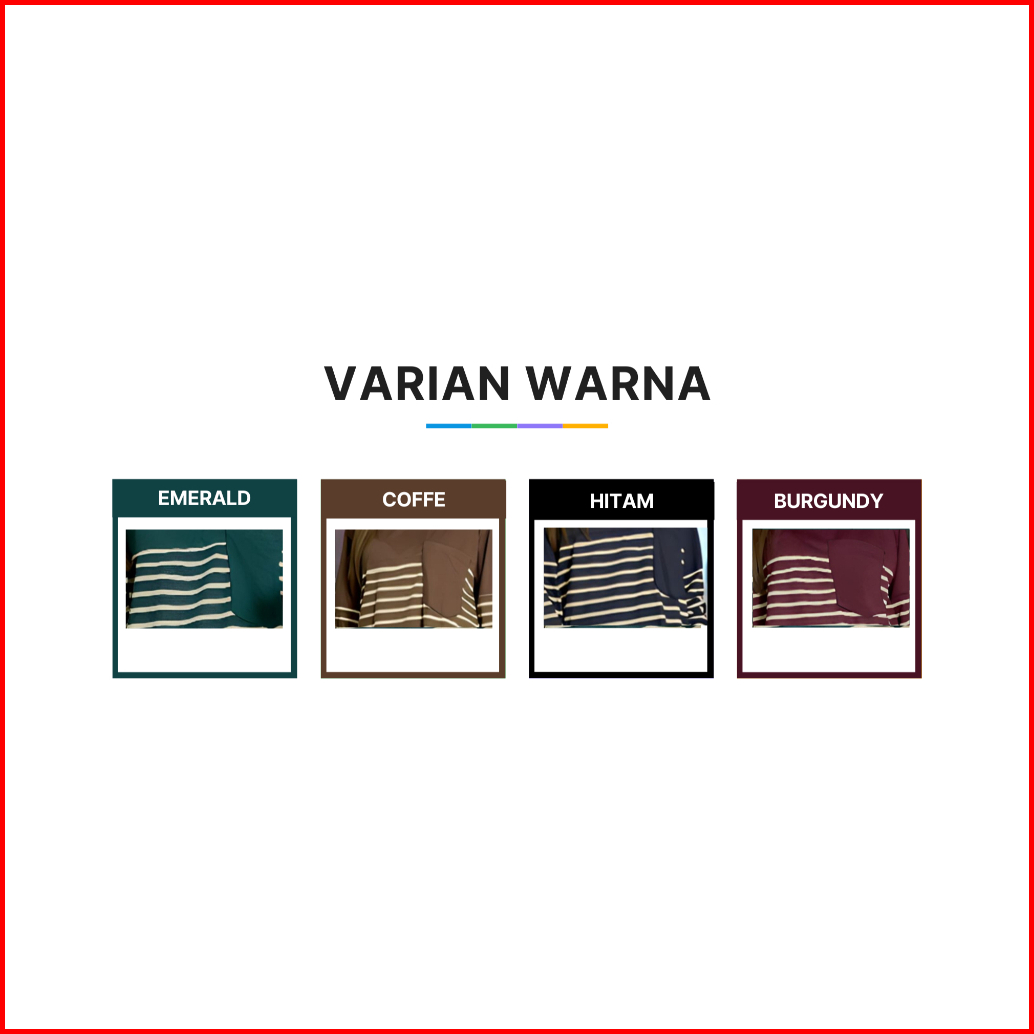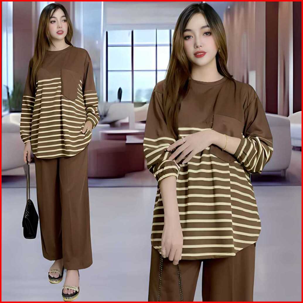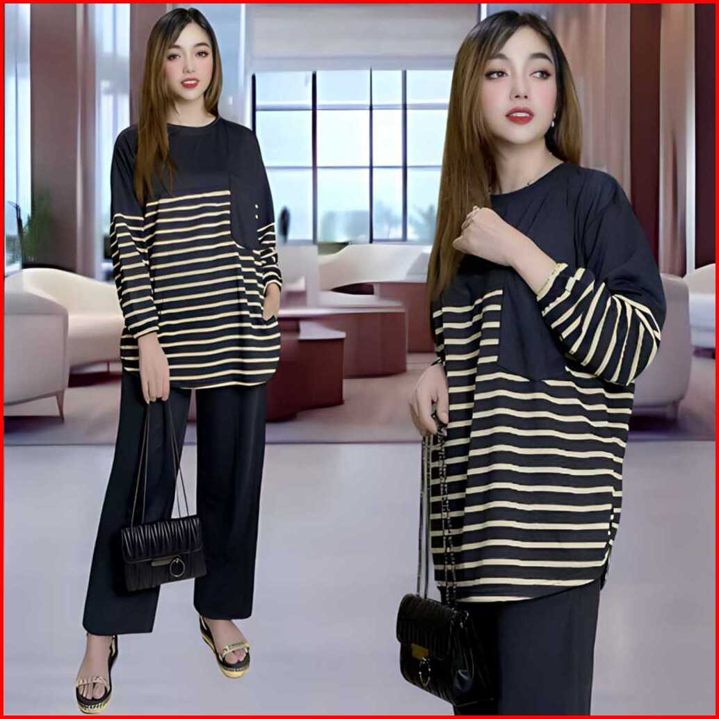 Davina Oneset Atasan Oval Kantong Dada Ld 120 Vistaterry Motif Salur Celana Karet Wanita Setelan Baju Basic Panjang Over