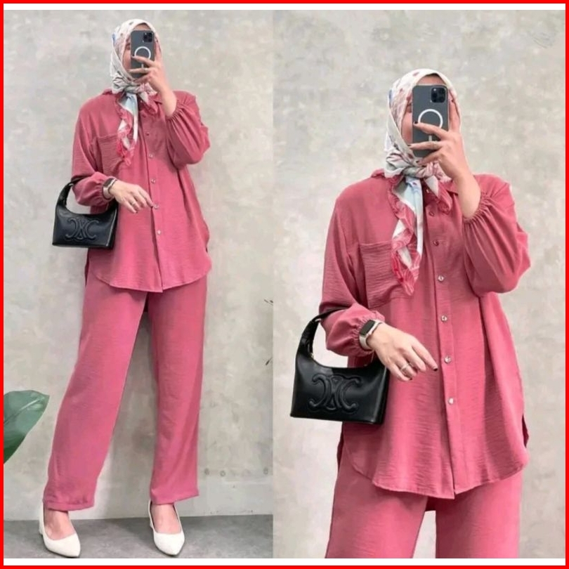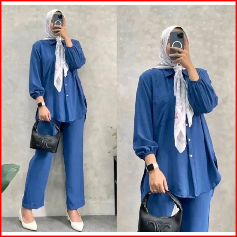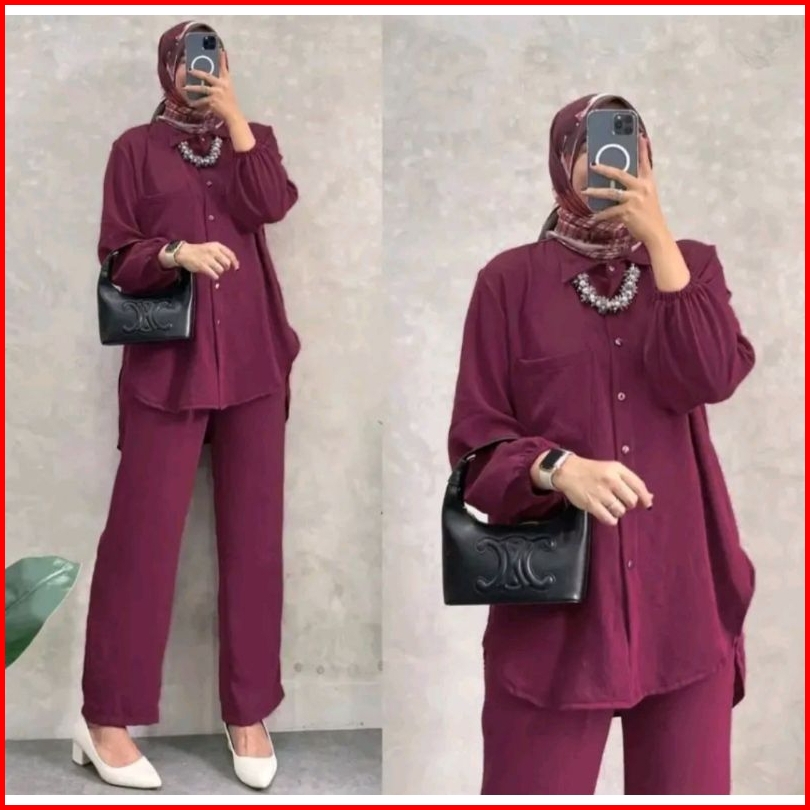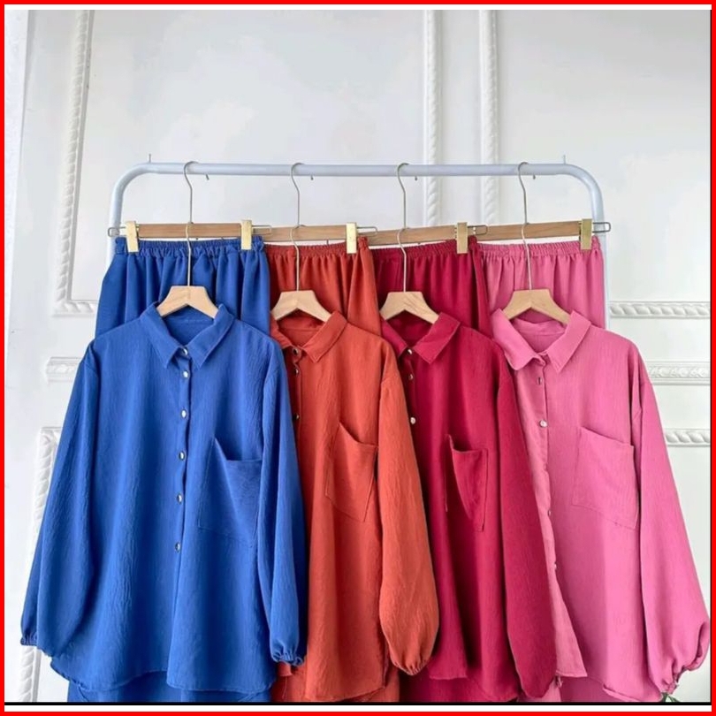 One Set Amanda Crinkle Kemeja Atasan Set Kerah Wanita Crinkle Set Panjang Pakaian Muslim