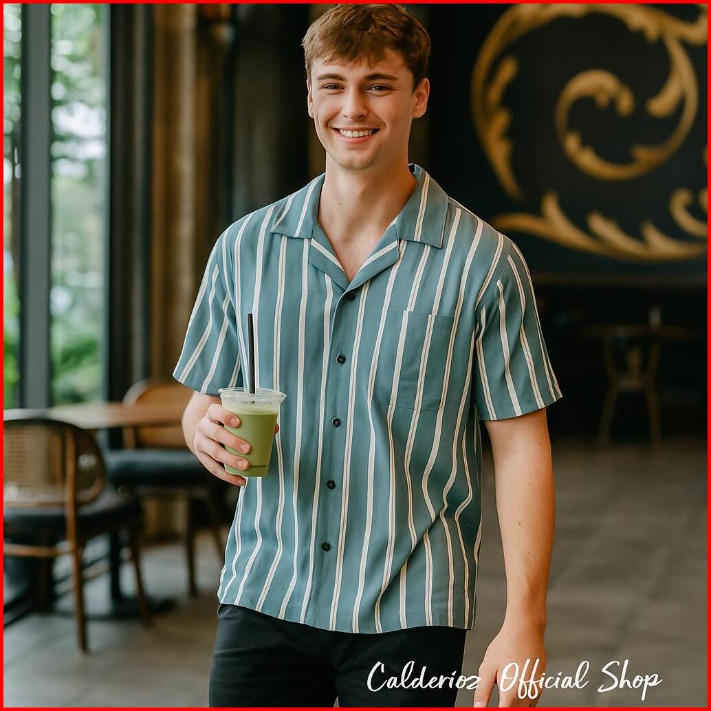 Calderioz - Baju Kemeja Hawai Pantai Bali Lengan Pendek Cowok Cewek Motif Salur Biru Putih