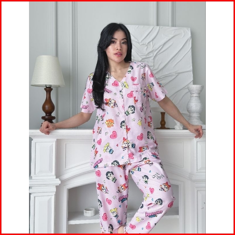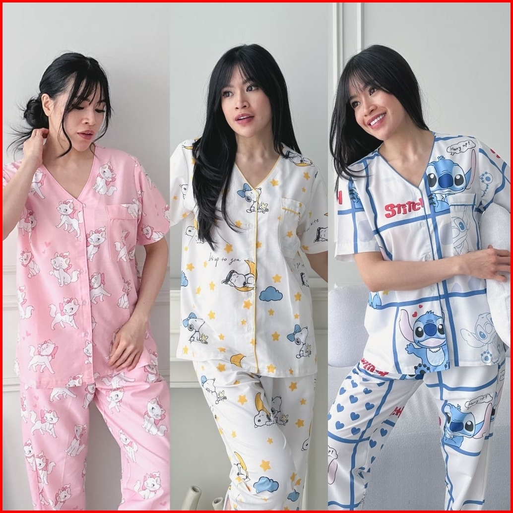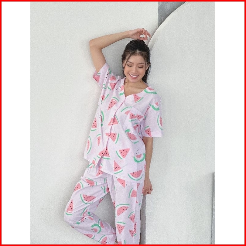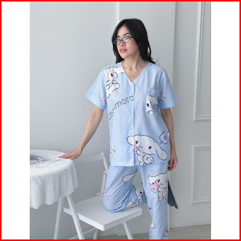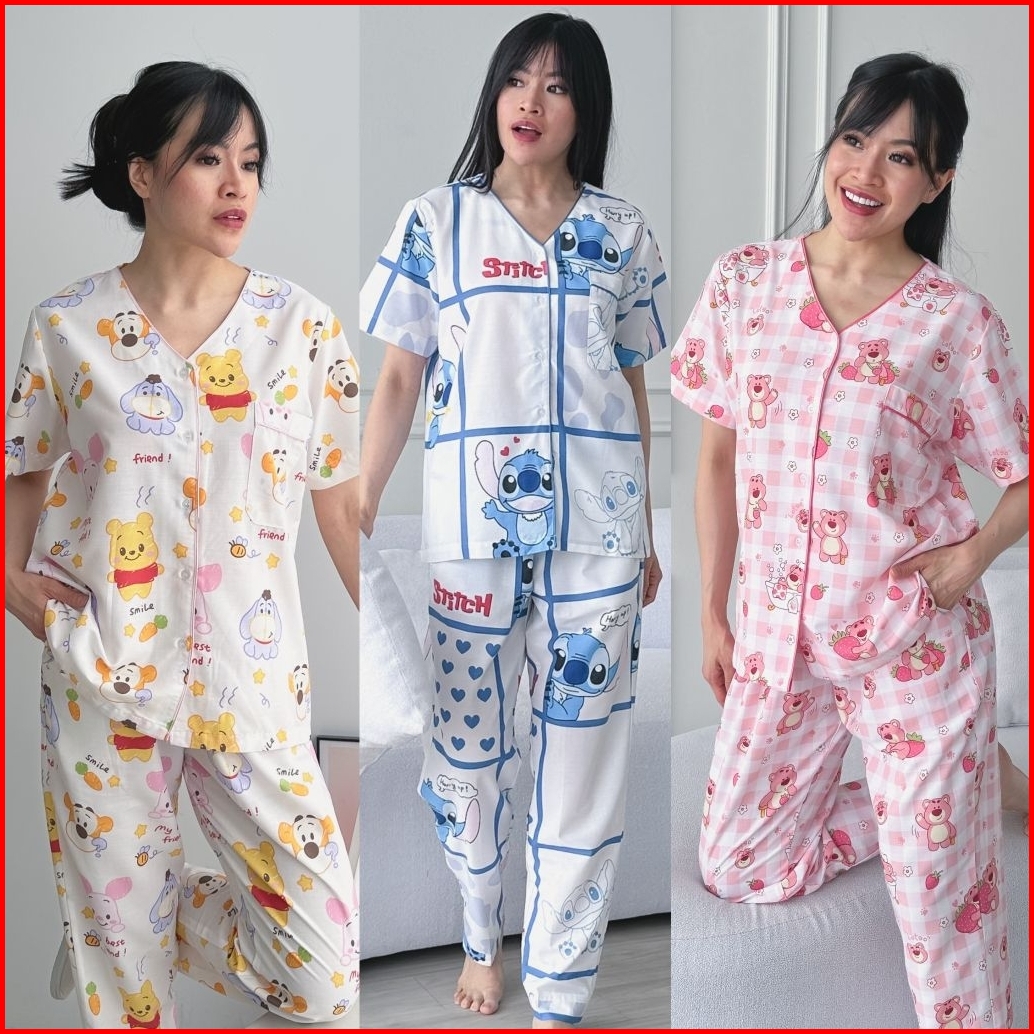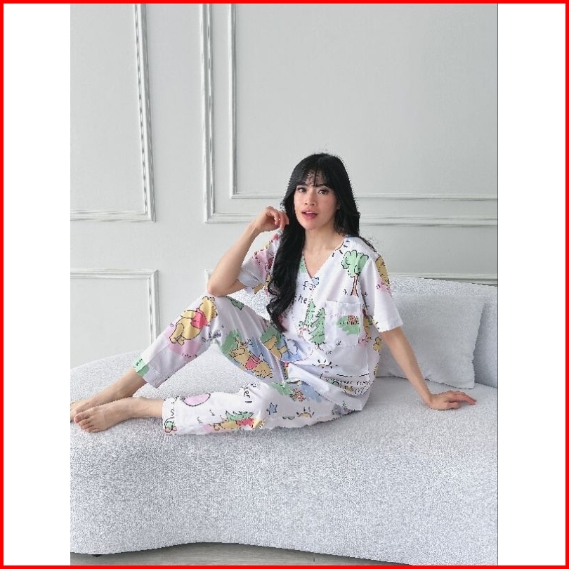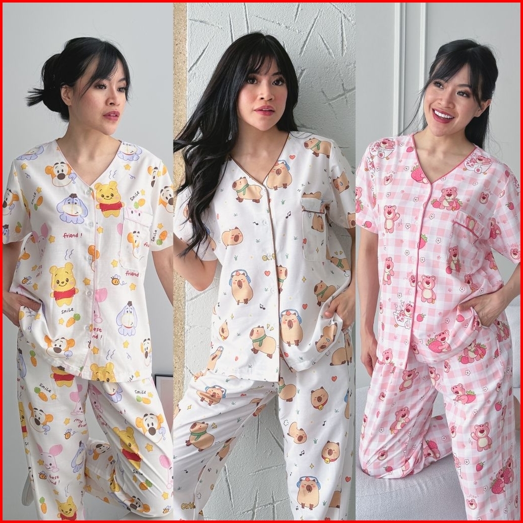 Piyama Celana Panjang Set Katun Tanpa Kerah Vneck - Baju Tidur Wanita Set