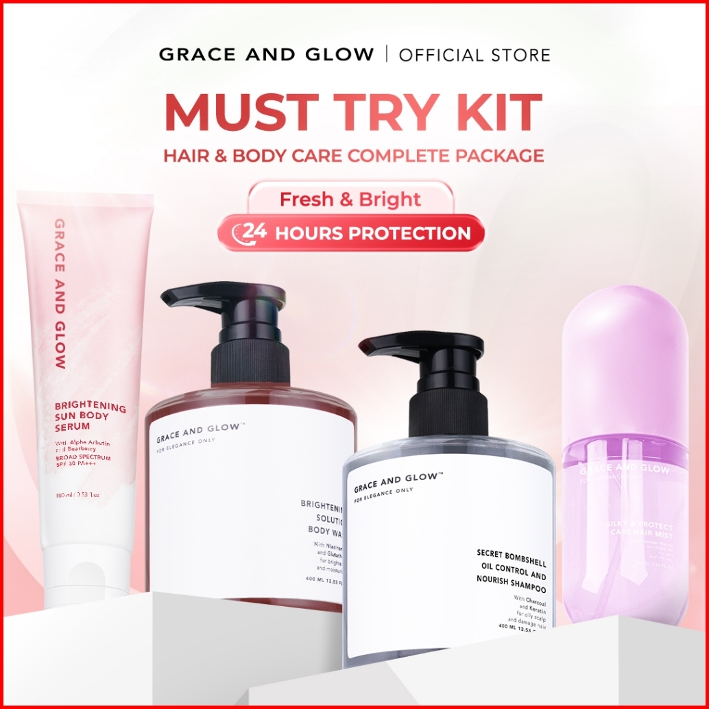 Grace And Glow Must-try Kit Bundle Brightening Body Wash Sabun Mandi Brightening Sun Body Serum Silky Protect Care Hair