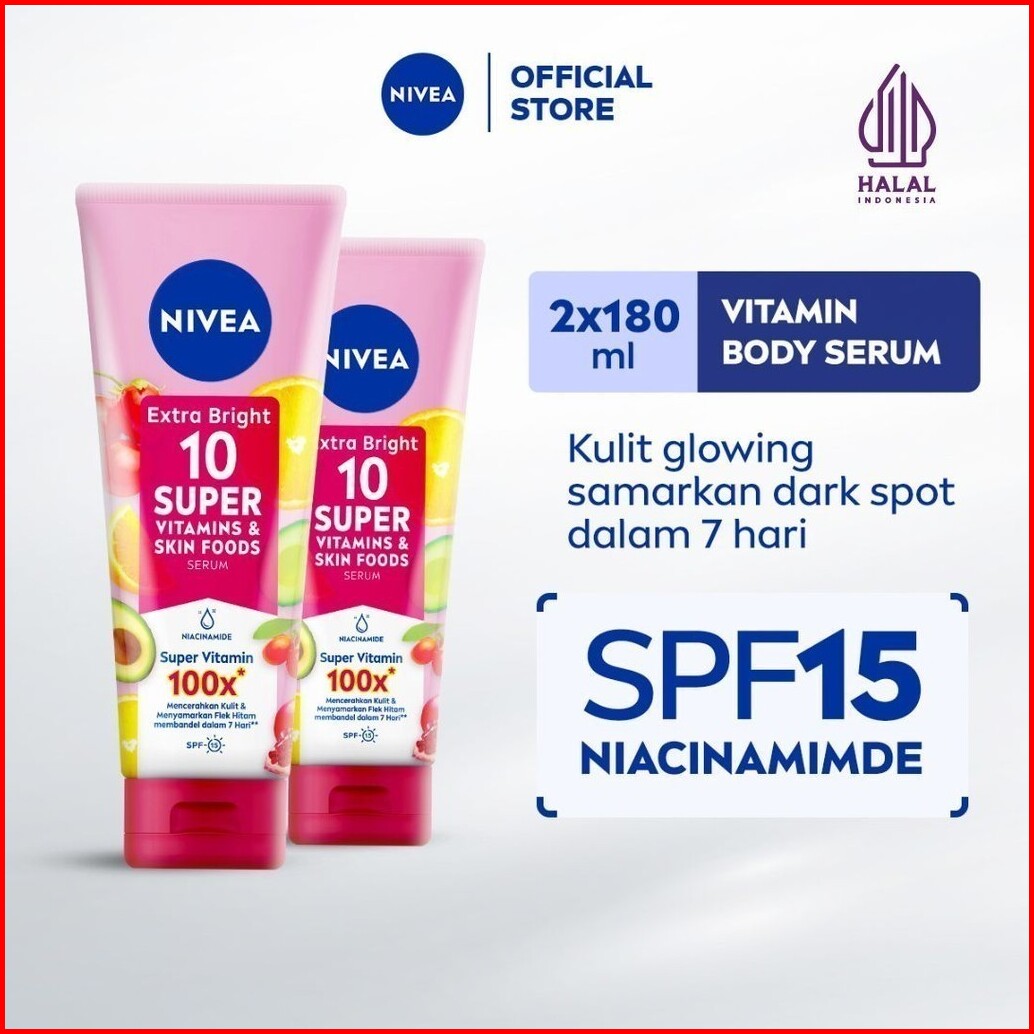 Paket Hemat Isi 2 Nivea Body Serum Extra Bright 10 Super Vitamins Spf15 180ml - Hand Body Serum Moisturizer Menyamarkan
