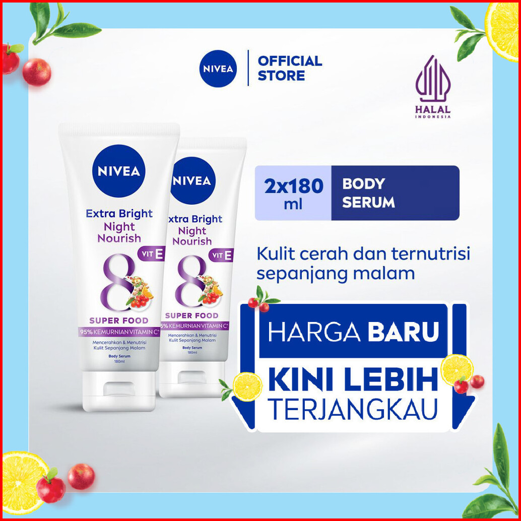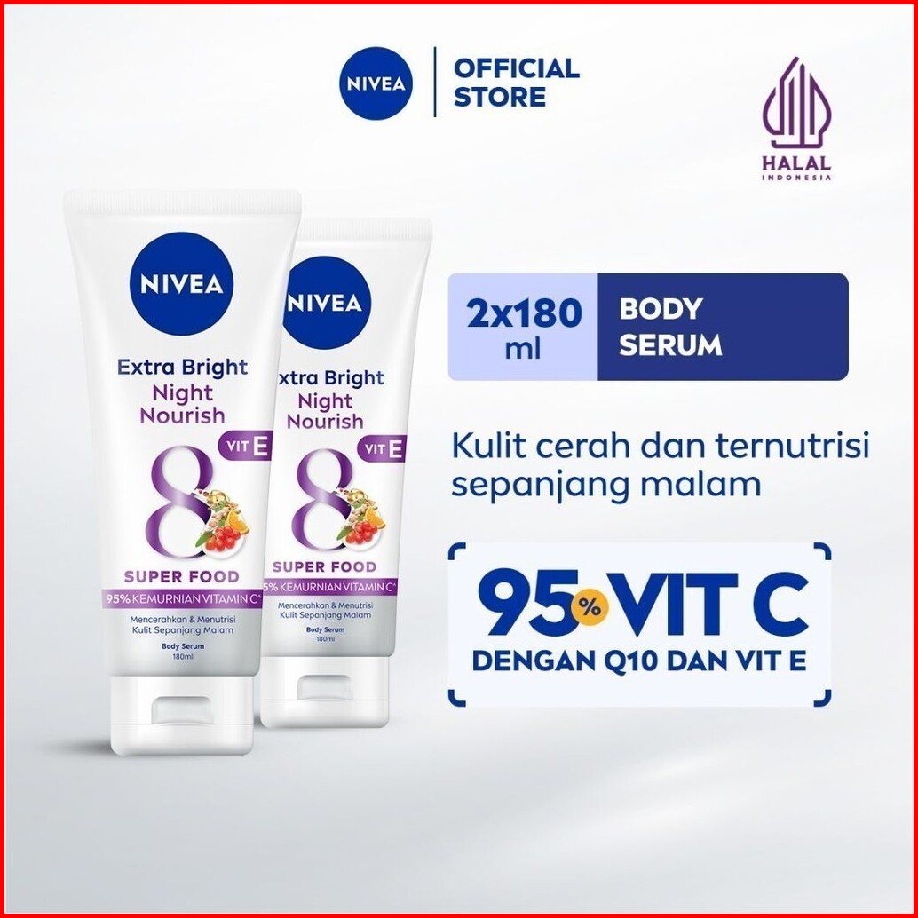 Paket Hemat Isi 2 Nivea Body Serum Extra Bright Night Nourish Vit E 180ml - Hand Body Serum Moisturizer Mencerahkan Kuli