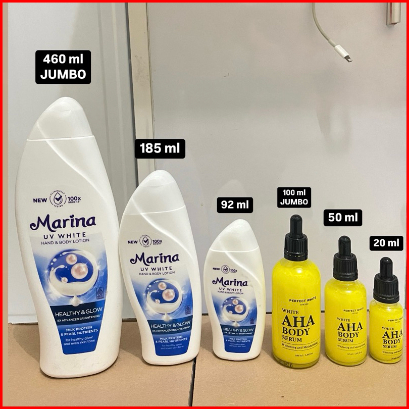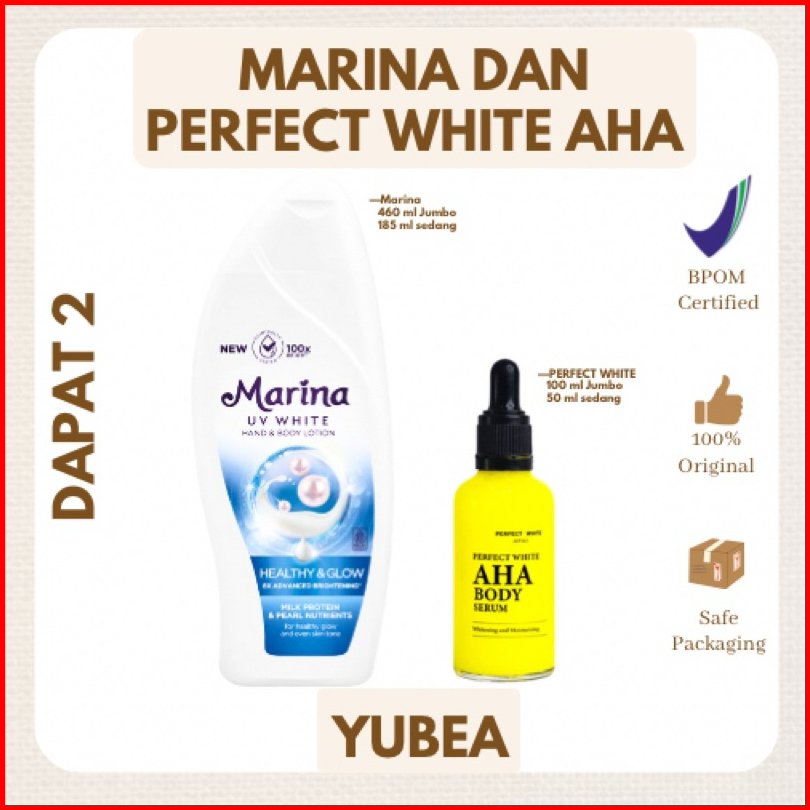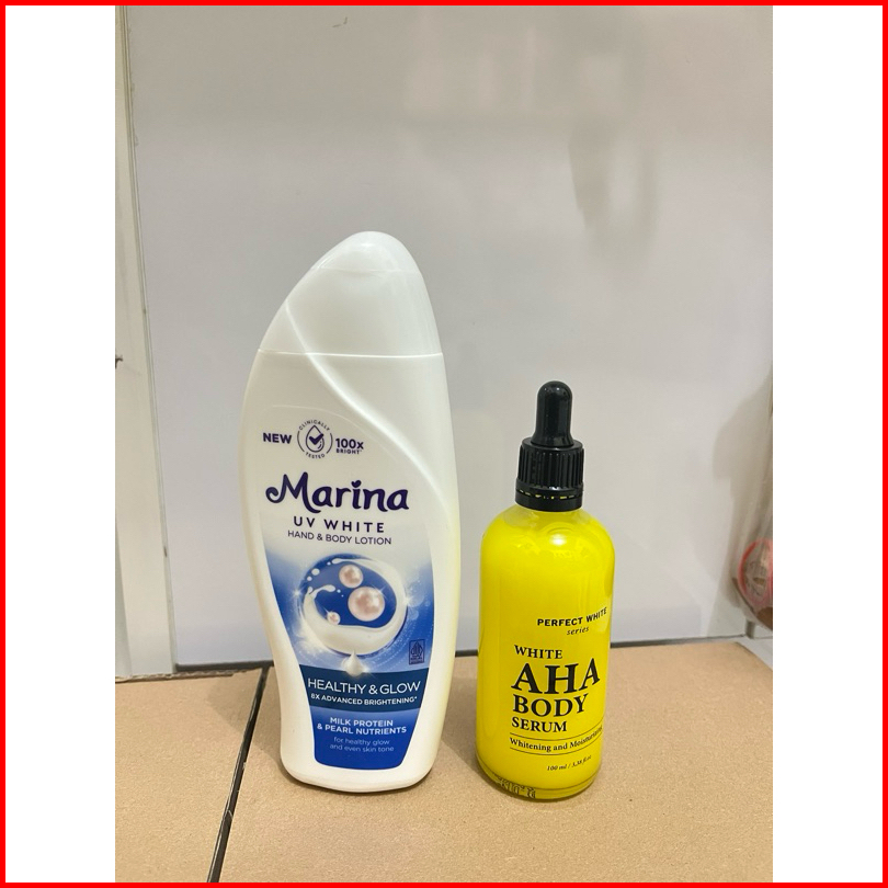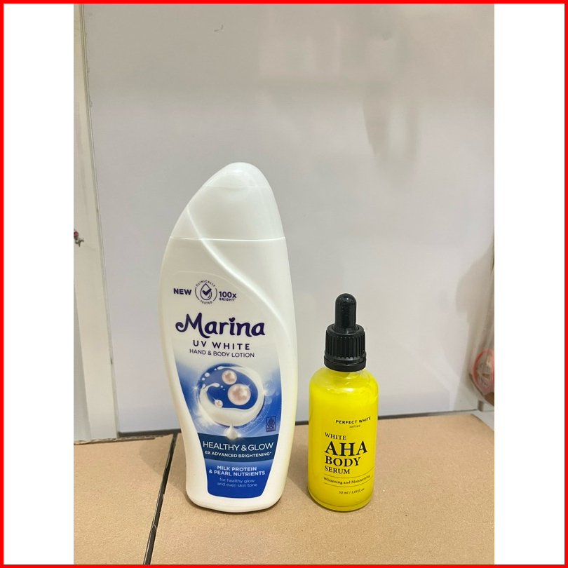Paket Mencerahkan Badan Marina Uv White Healthy And Glow 185 460 Ml Dan Perfect White Aha Body Serum 20 50 100ml
