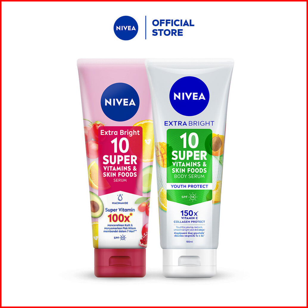 Nivea Body Serum Extra Bright 10 Super Vitamins Skin Foods Niacinamide Collagen 180ml X2 - Mencerahkan Menyamarkan Noda