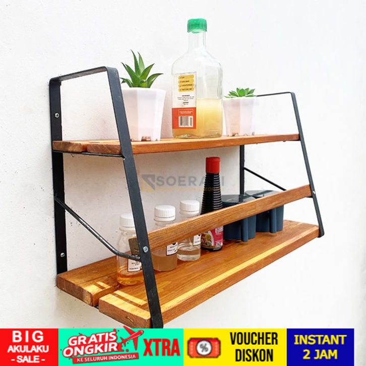 KUSKA Rak Dinding Tempel Gantung AmKUbalan Susun Tingkat 2 Dapur Besi dan Kayu Penyimpanan Alat Masak Bumbu Botol Sendok