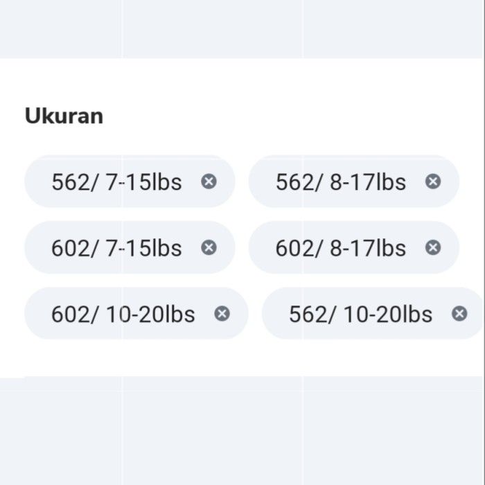562/ 10-20lbs, 562/ 7-15lbs, 562/ 8-17lbs, 602/ 10-20lbs, 602/ 7-15lbs, 602/ 8-17lbs
