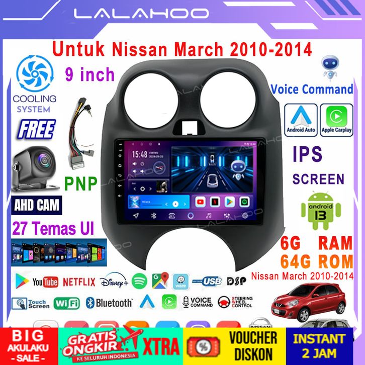 FREE ONGKIR Untuk Nissan March 2010FREE ONG-2014 |6G+64G Android 13 Head Unit Termasuk Frame/PNP Soket 9 Inch IPS Screen