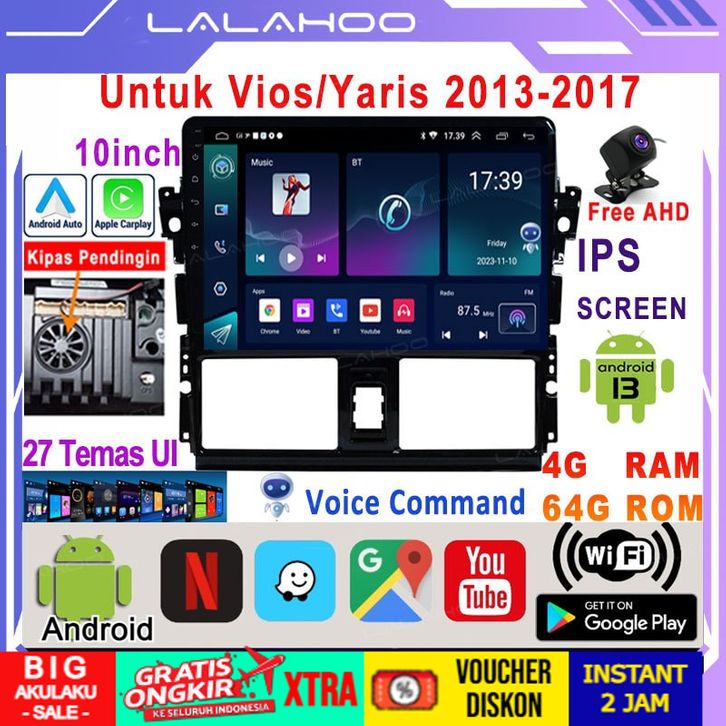 FREE ONGKIR Untuk Toyota Vios/Yaris 2FREE ONGK013-2017| 6G+64G Android 13 Head Unit Termasuk Frame/PNP Soket 10 Inch IPS
