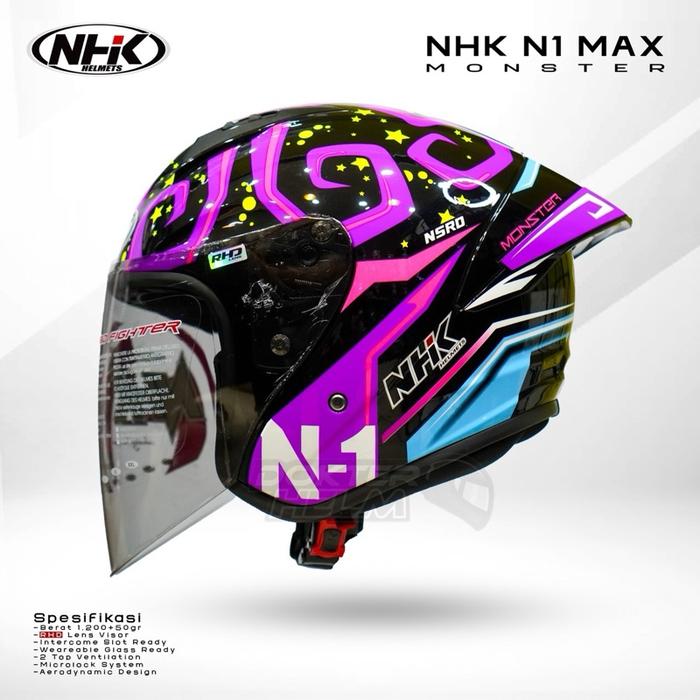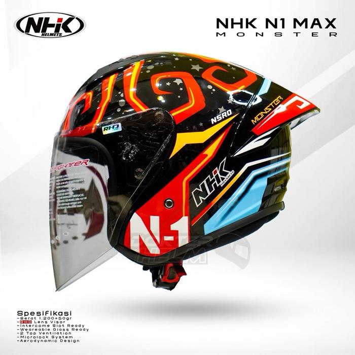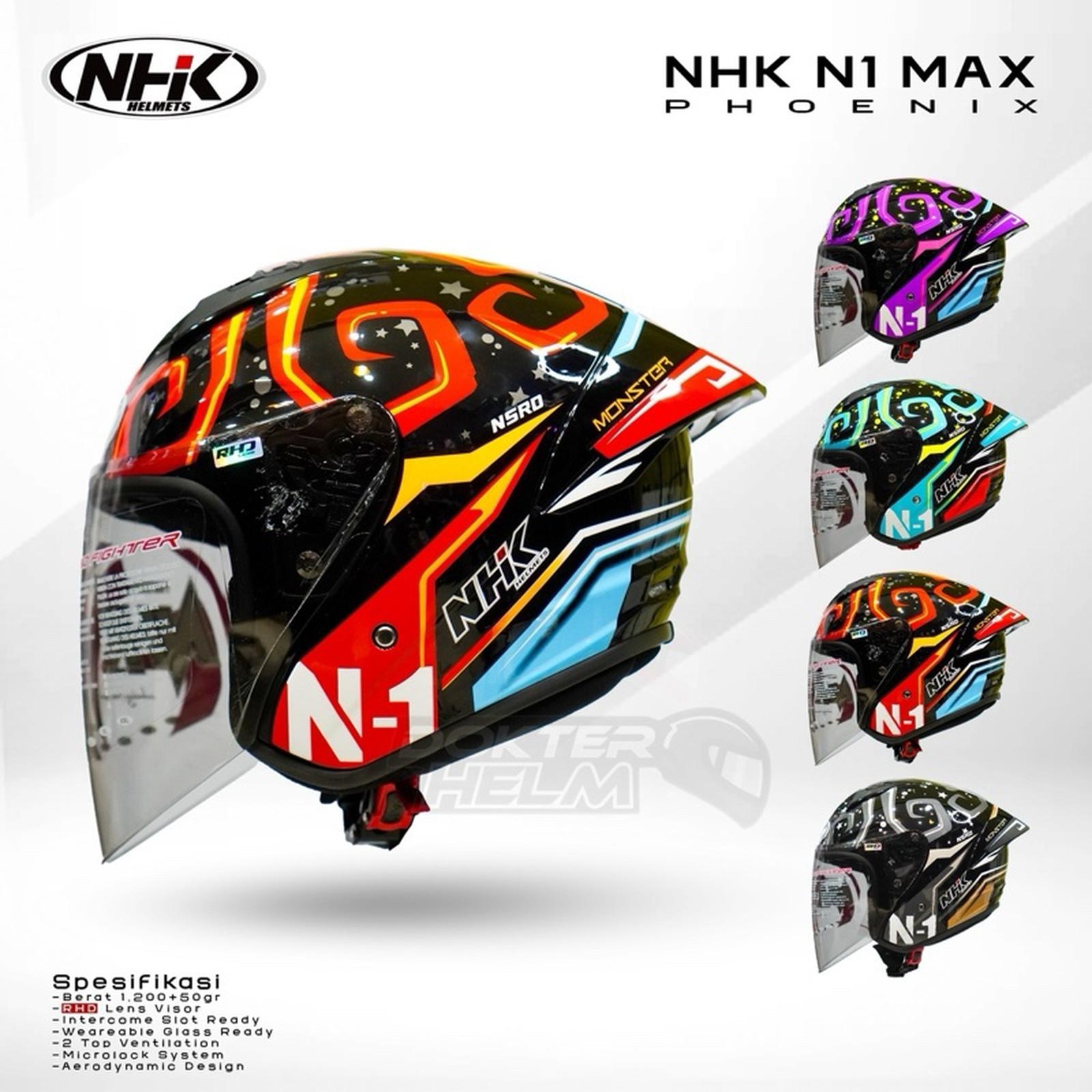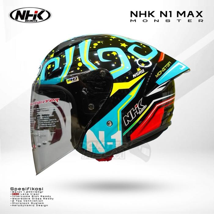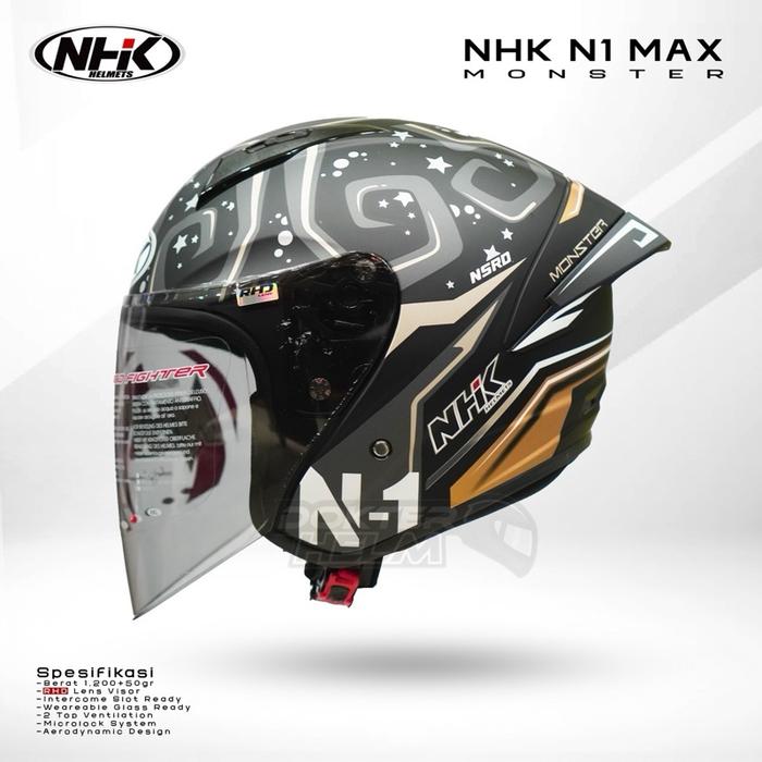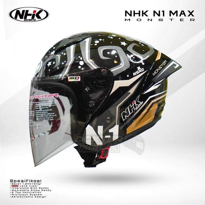 HELM NHK N1 MAX MOTIF MONSTER VISOR RHD LENS LIGHT SMOKE HALF FACE ORIGINAL SNI - BLACK SILVER GLOSY, M