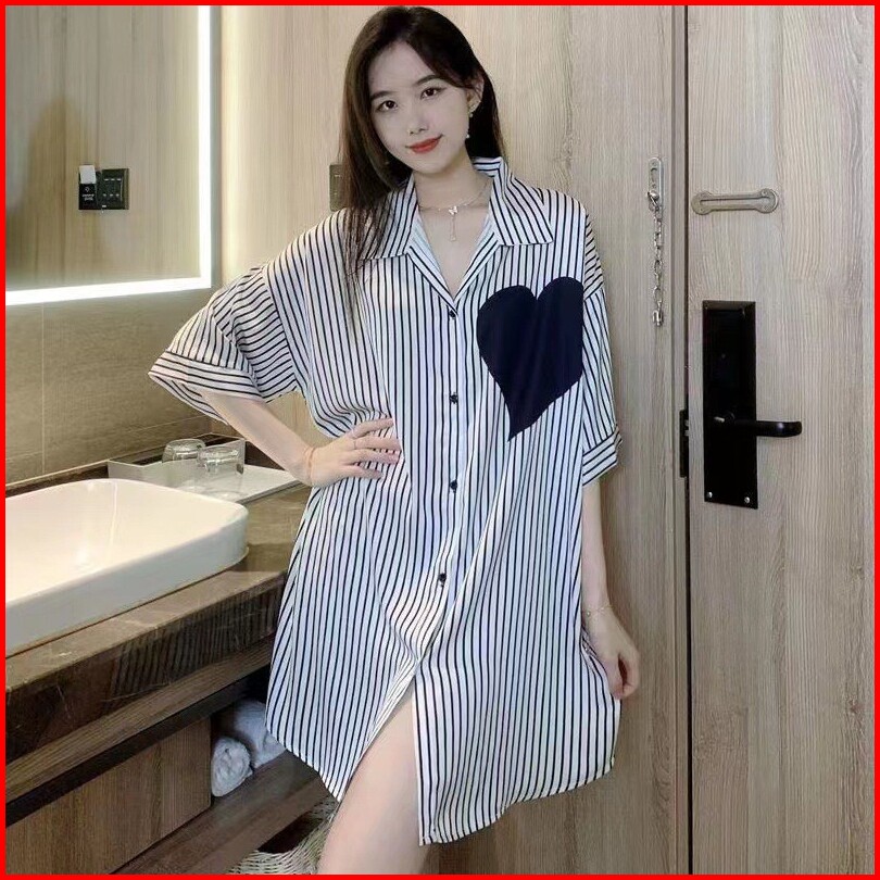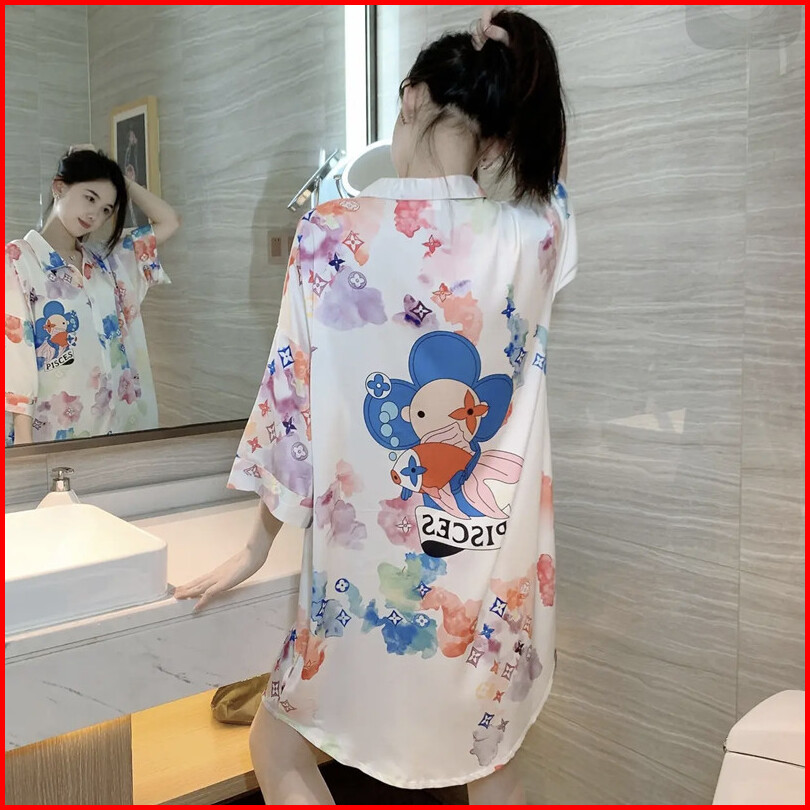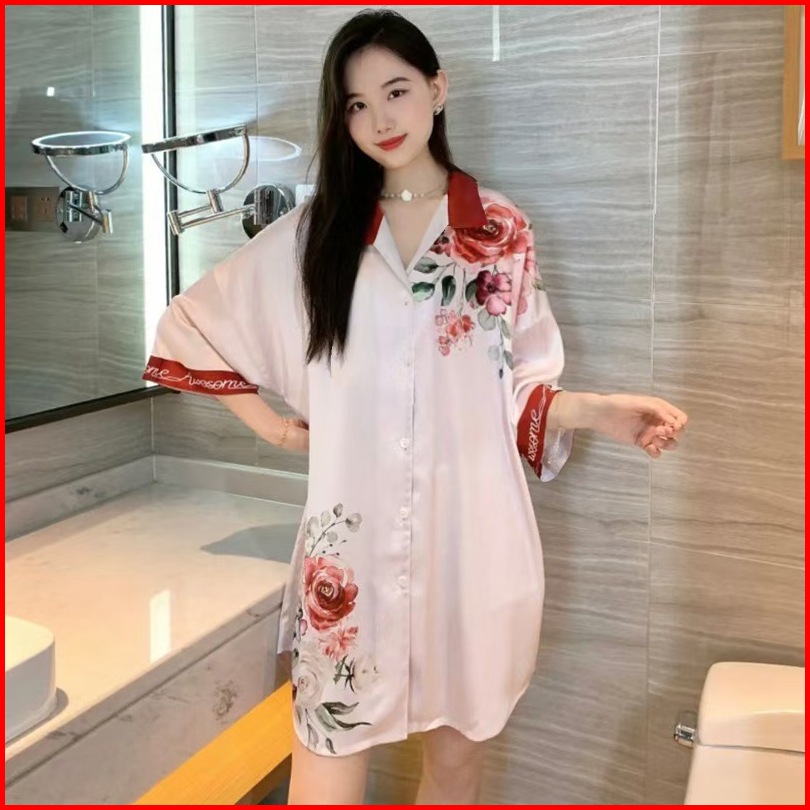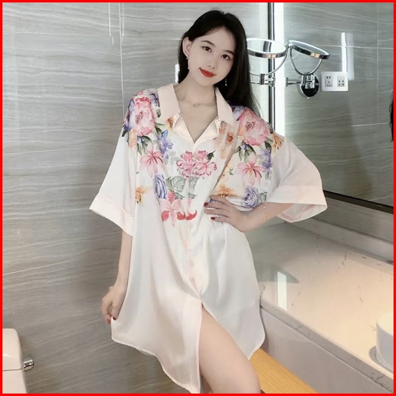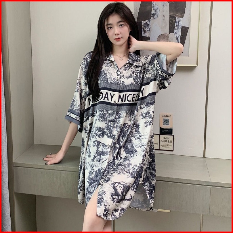 Piyama Gaya Korea Untuk Wanita Baju Tidur Renda Musim Panas Gaun Piyama Kemeja Seksi Longgar Tipis Lengan Pendek Sutra E