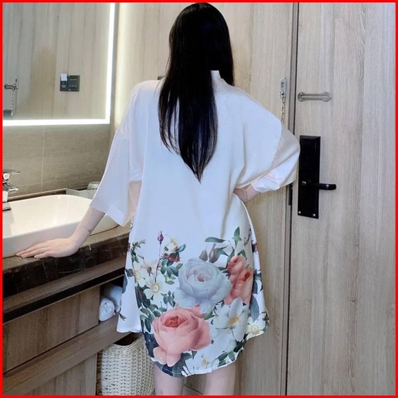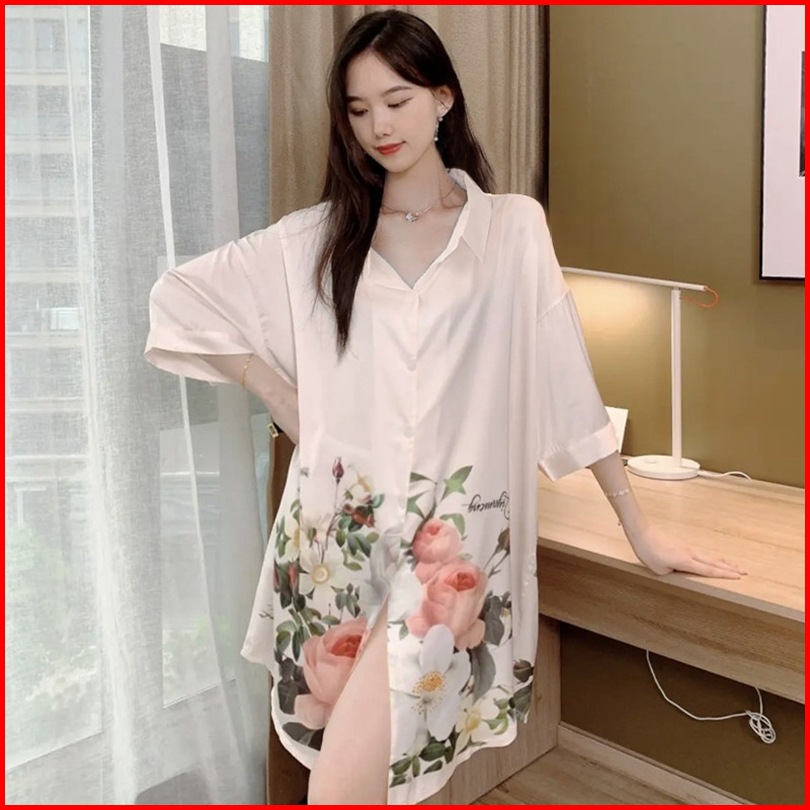 Piyama Dress Wanita Sexy Jumbo Sutra Es Bunga Print Dress Tidur Korea Style
