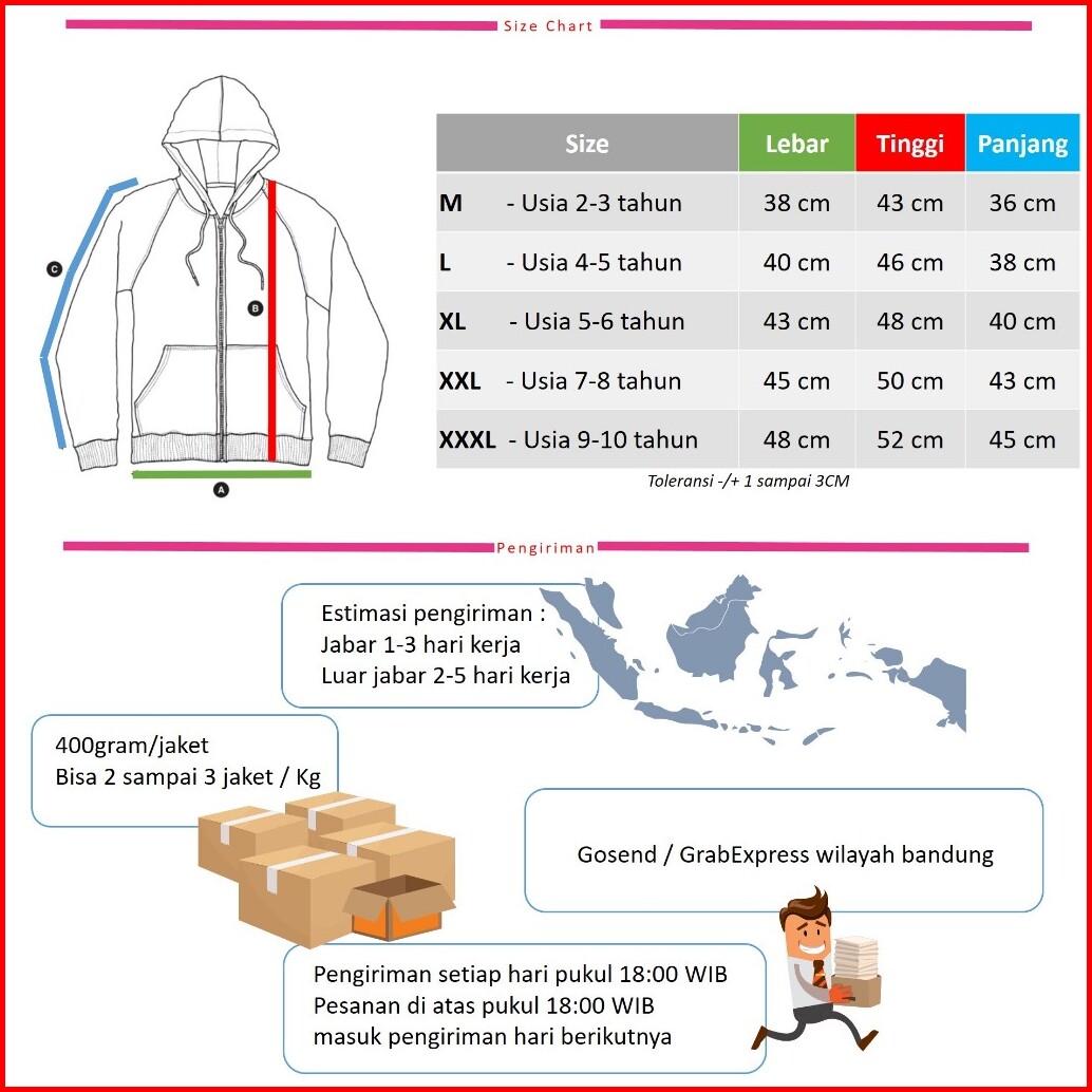 M 2-3 Tahun, L 4-5 Tahun, XL 5-6 Tahun, XXL 7-8 Tahun, XXXL 9-10 tahun