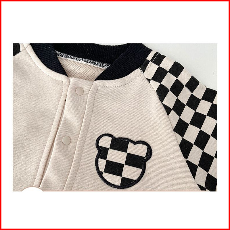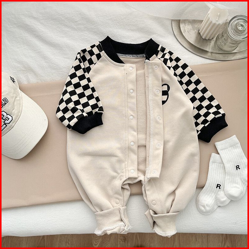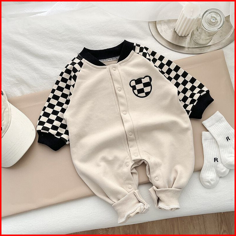 Baju Bayi Lengan Panjang 0-18 Bulan Jumper Bayi Unisex Motif Kotak Hitam Krem Premium