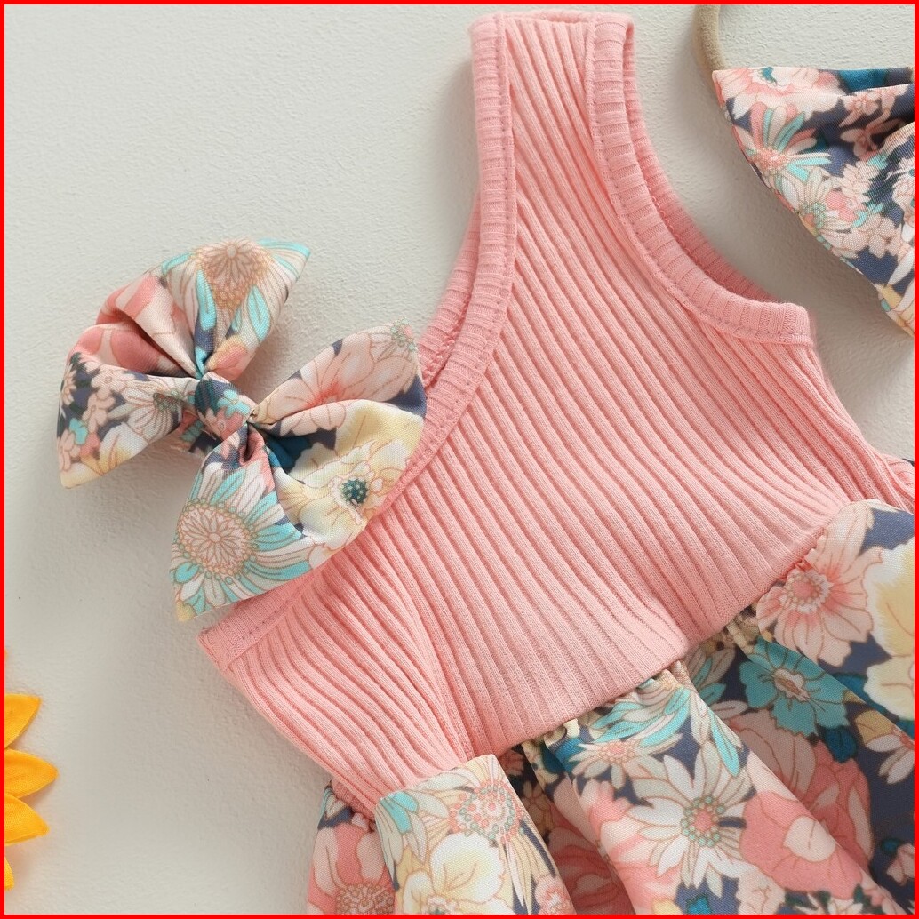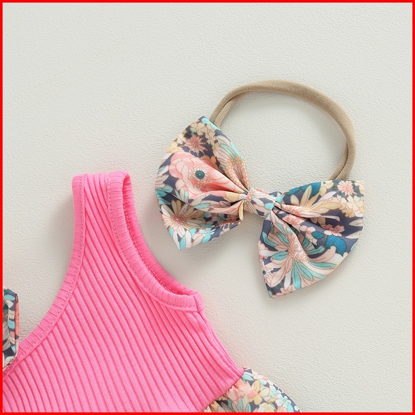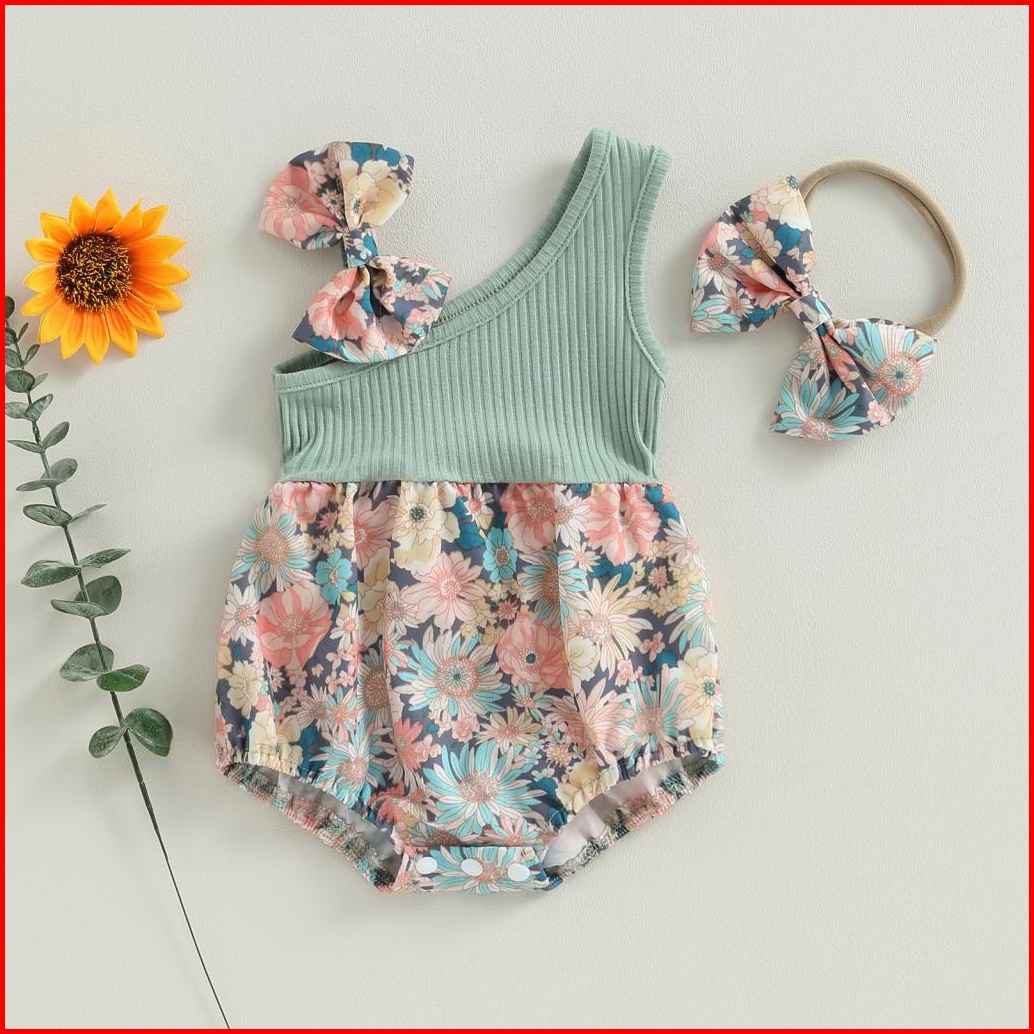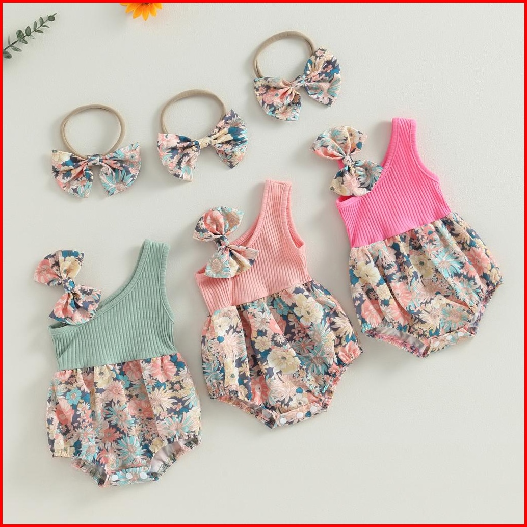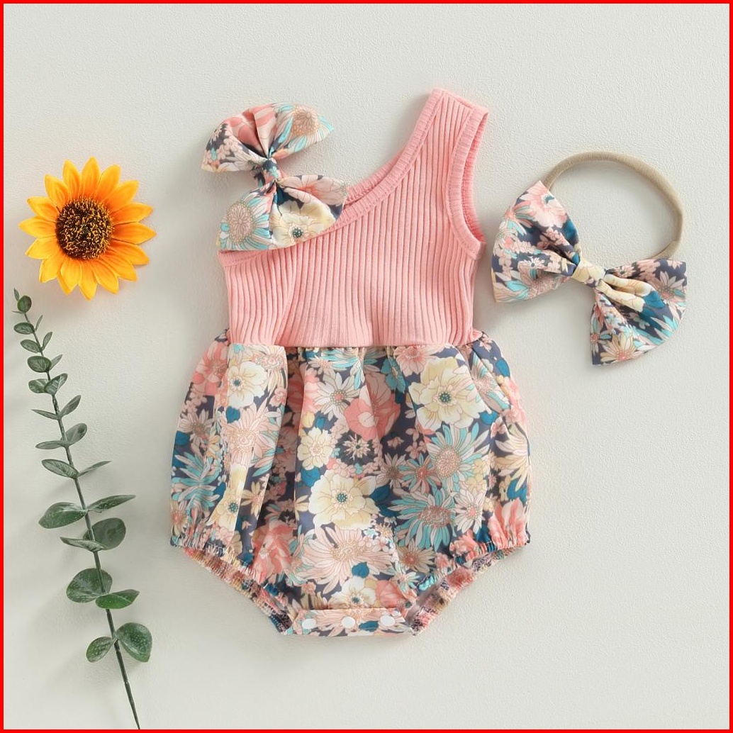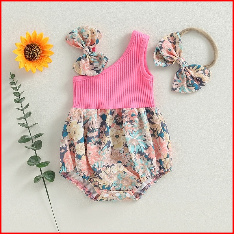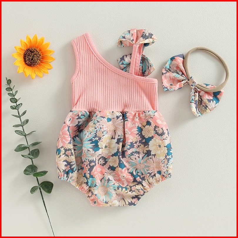 Pakaian Dua Potong Bayi Perempuan Baju Monyet Satu Bahu Bermotif Bunga Musim Panas Dan Ikat Kepala Elastis Pakaian Lucu