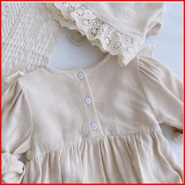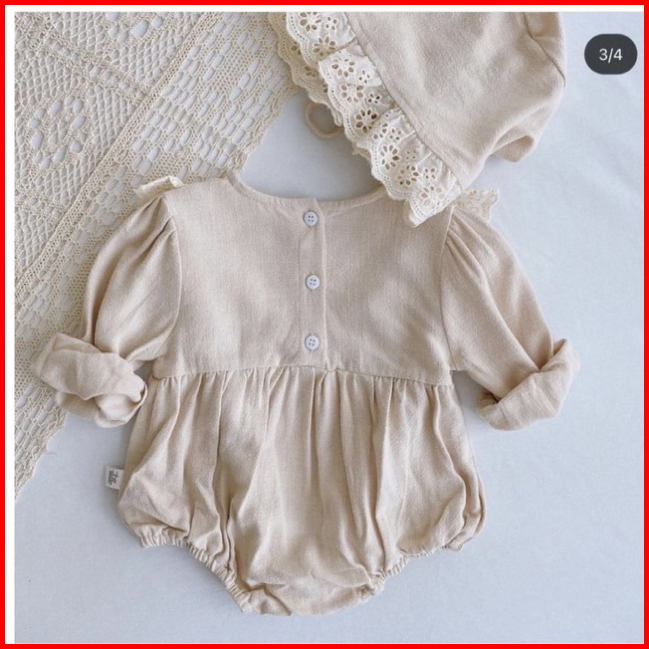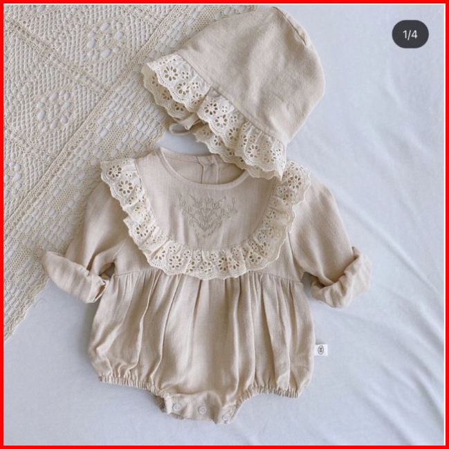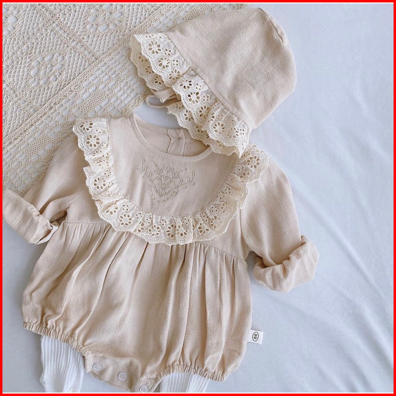 Littleflamingo Korean Jumpsuit Renda Bayi Setelan Baju Dan Topi Warna Beige Untuk Anak Perempuan Lucu Ready Stock