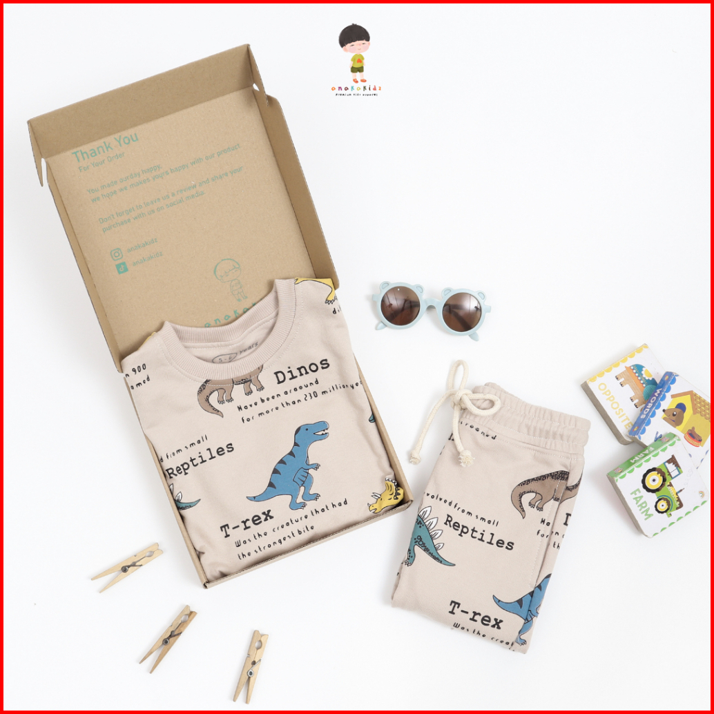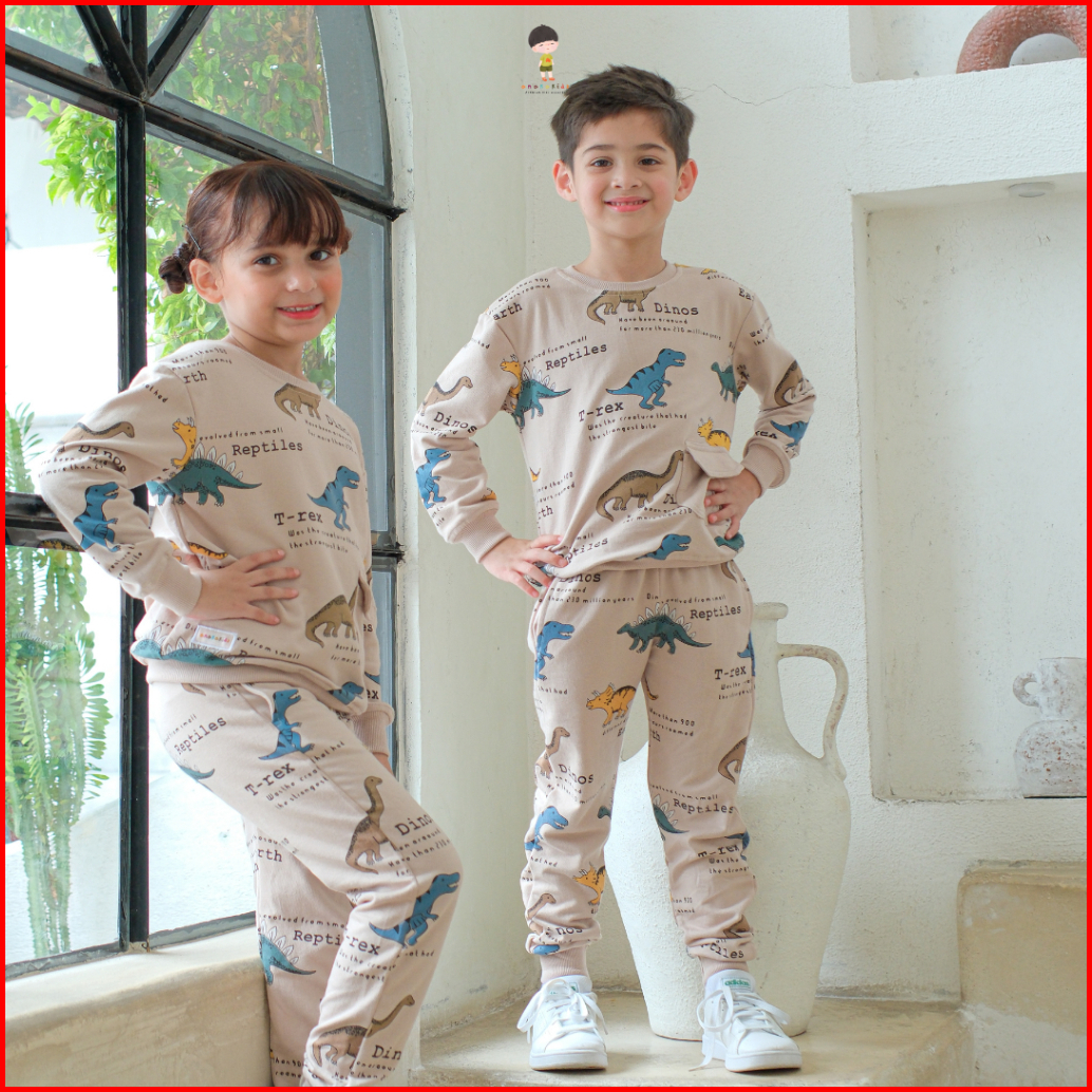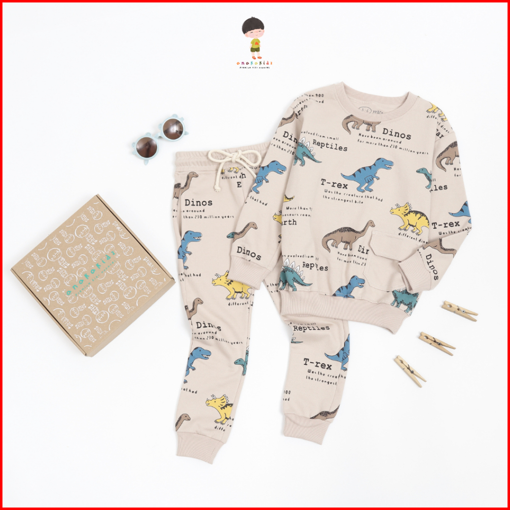 Anakakidz Sweater Crewneck Jogger Anak Set Fullprint Dino Light Brown Setelan Anak Unisex 1 - 10 Tahun