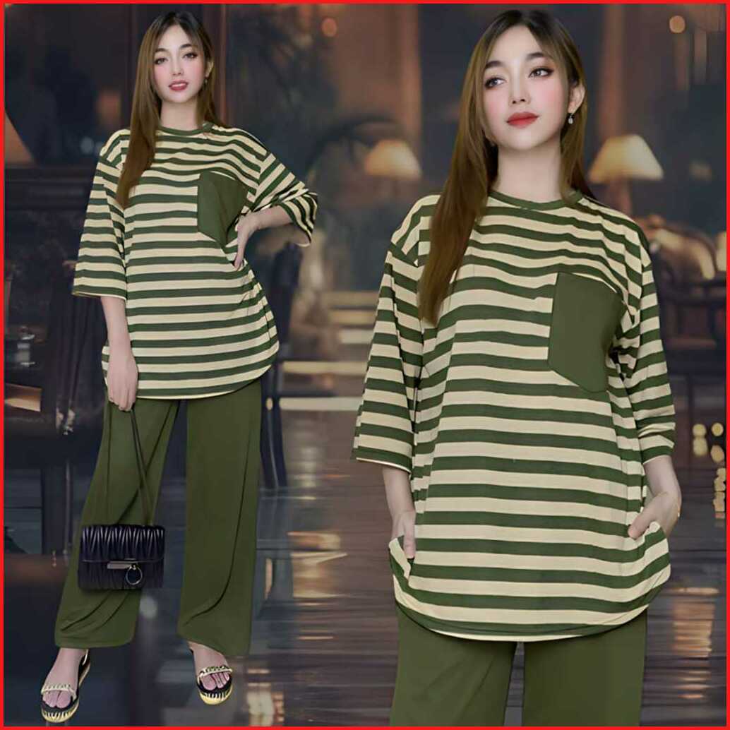 Aufaa Oneset Atasan Oval Kantong Dada Ld 120 Vistaterry Motif Salur Celana Karet Wanita Setelan Baju Basic Panjang Overs