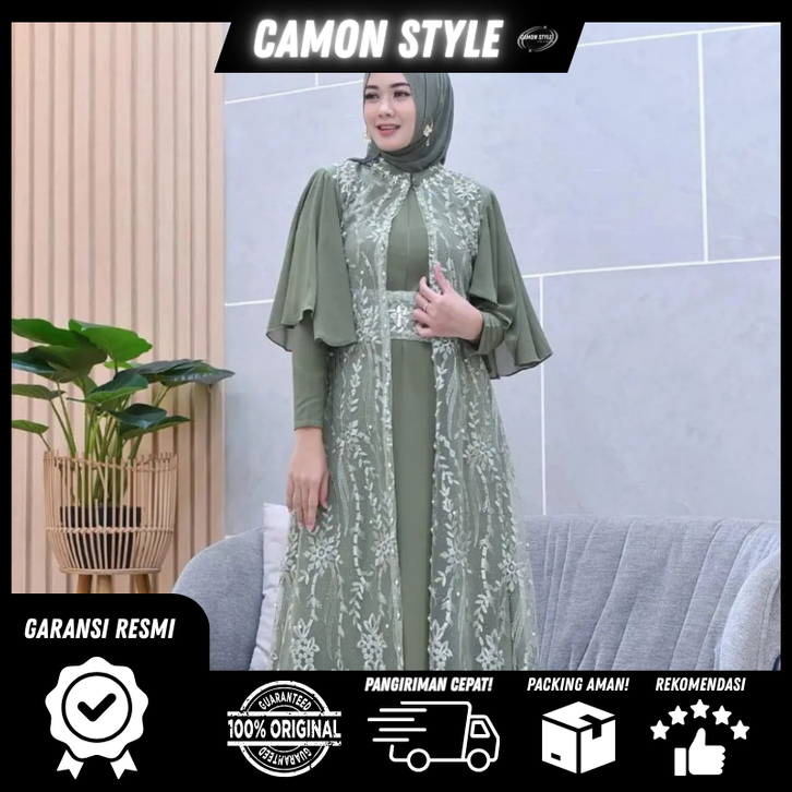Dress Outer Brukat Pesta Terbaru 2024 Dress Green Sage Gamis Clarisa By Ghina Set Inner Outer Free Belt Matt Ceruty Mix