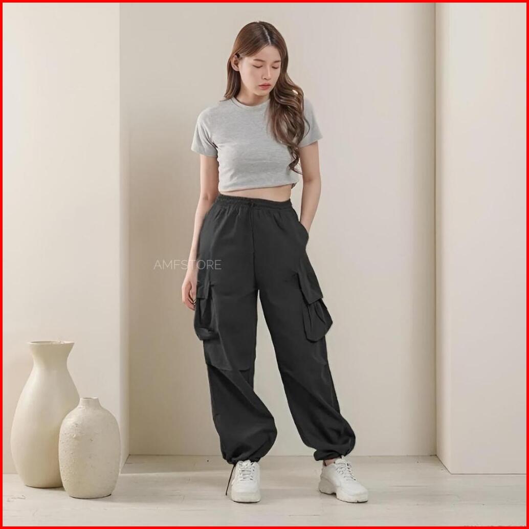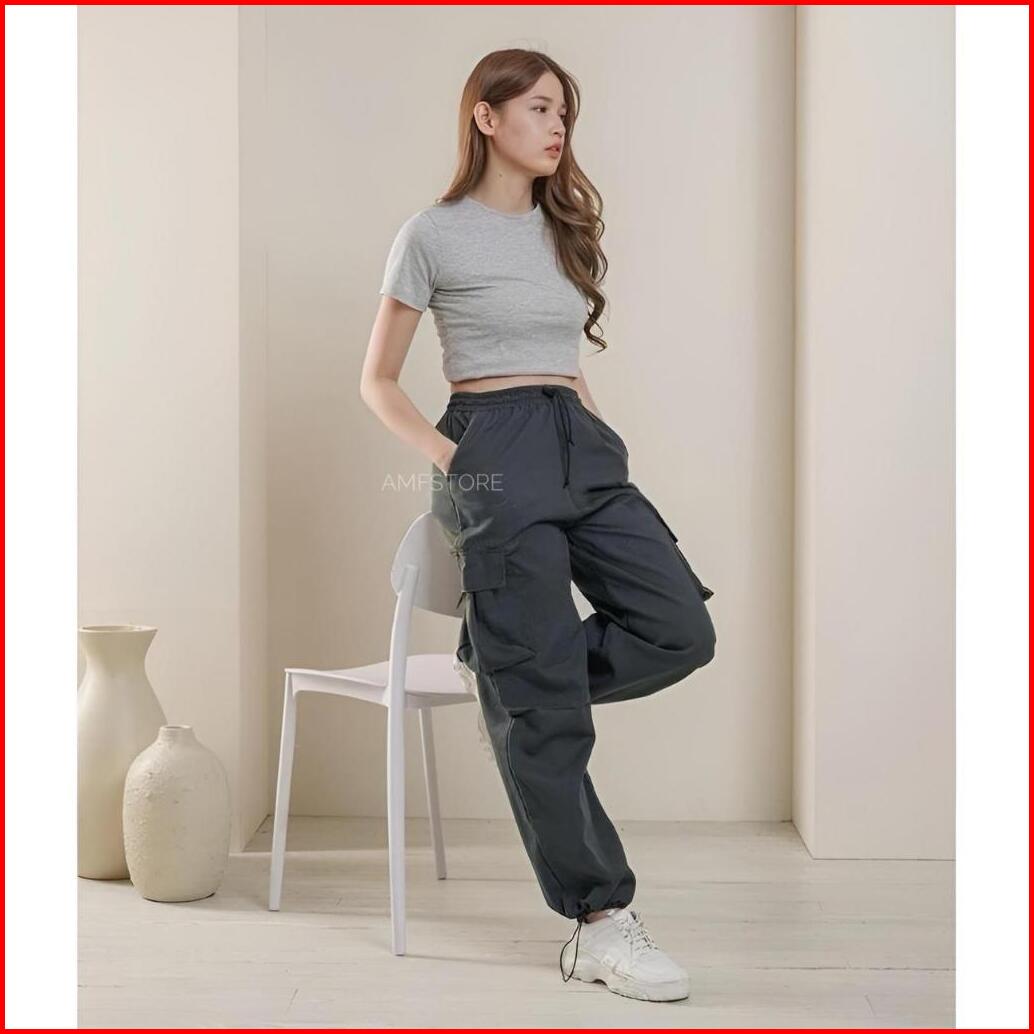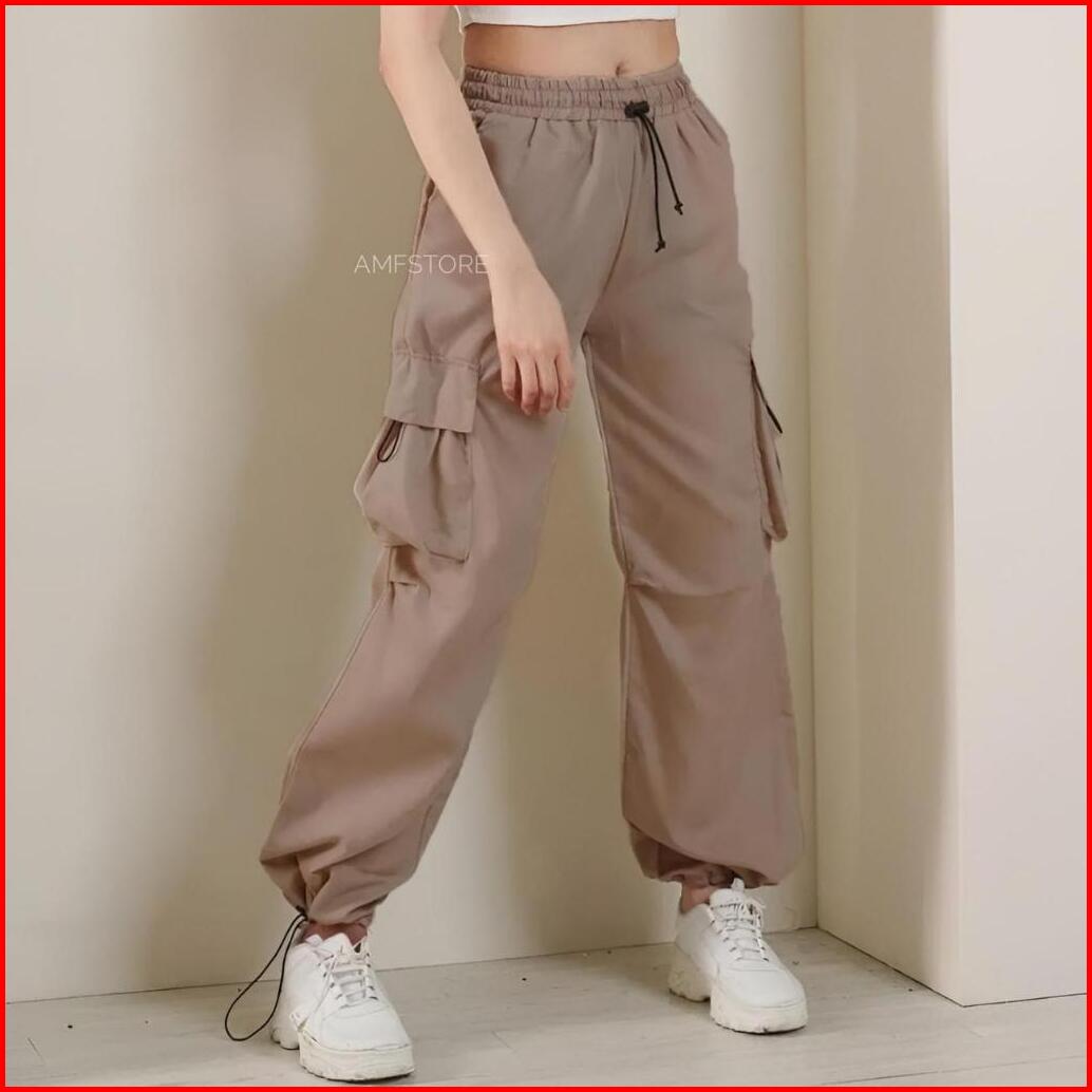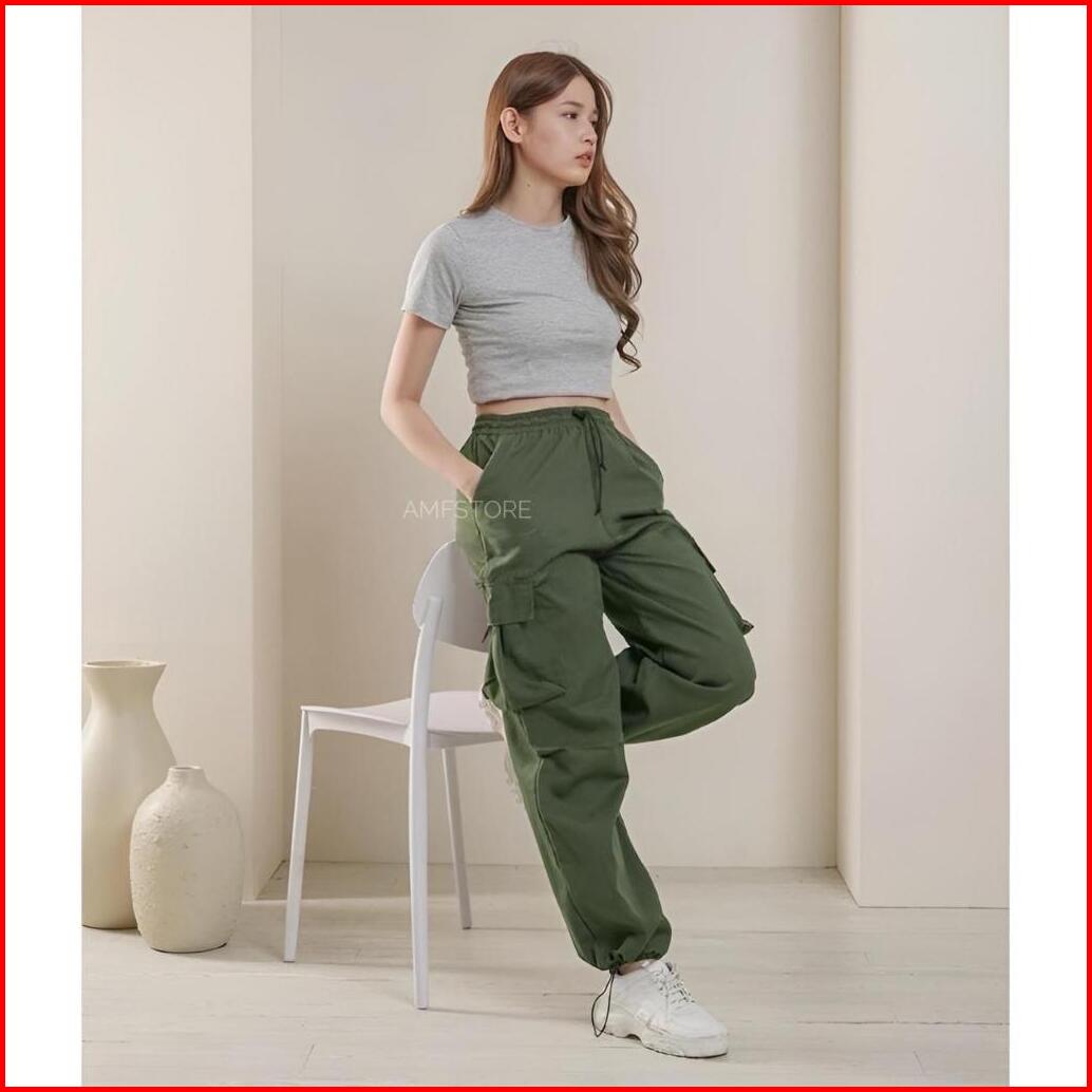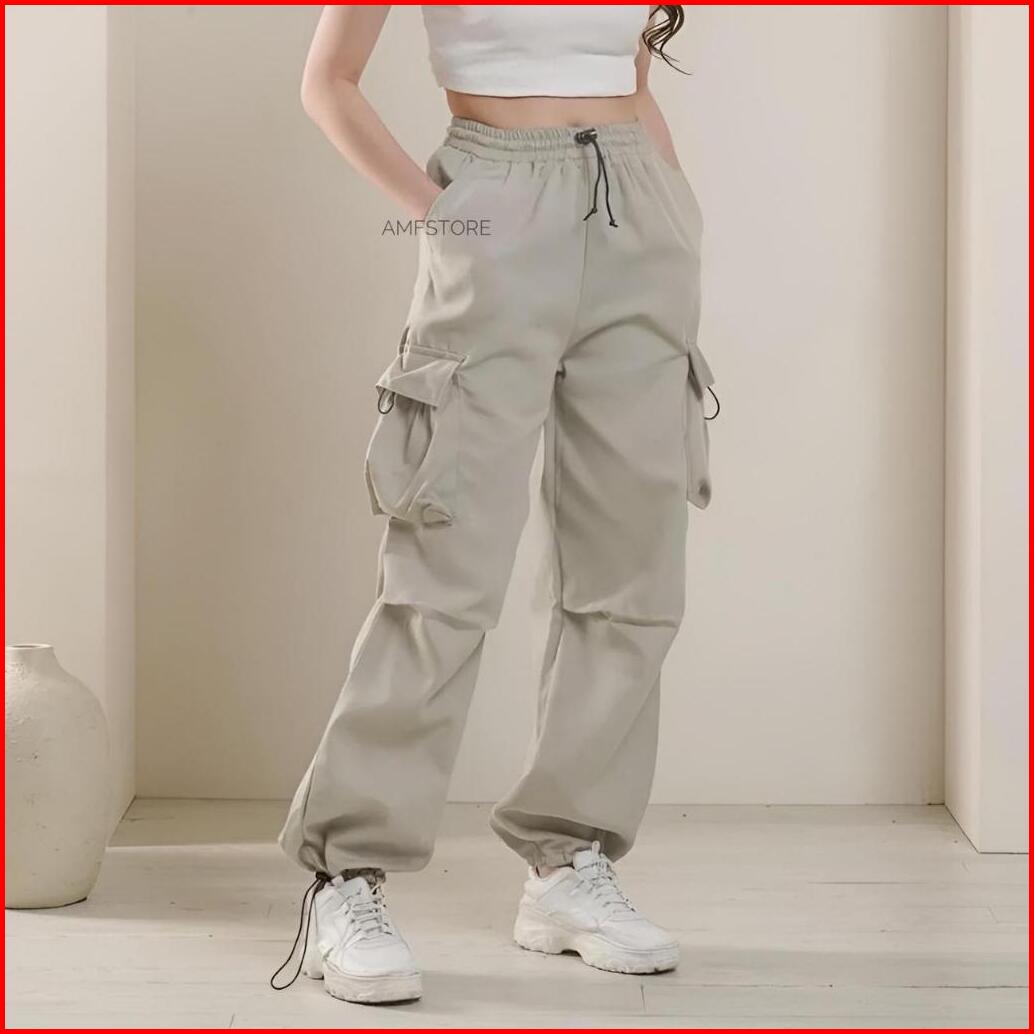 Highwaist Kiya Cargo Pants Loose Wanita Pinggang Karet Celana Cewek Serut Korean Style Jumbo Terbaru