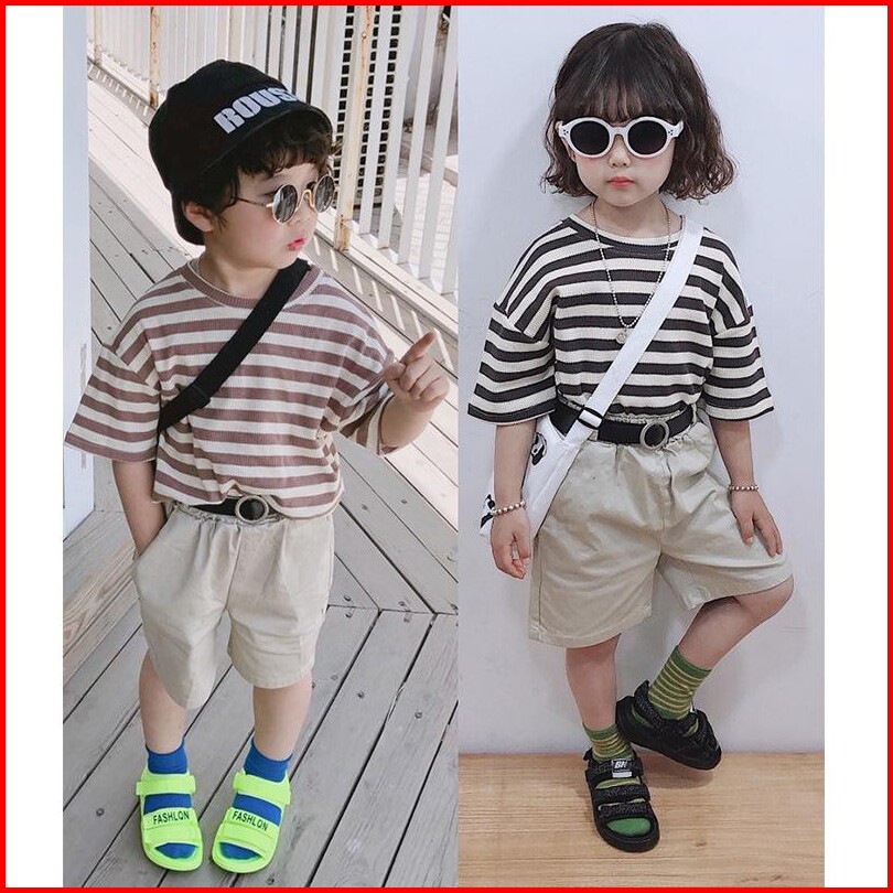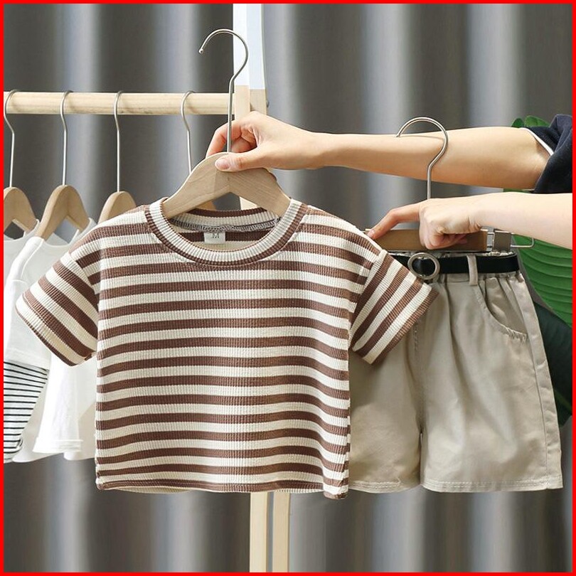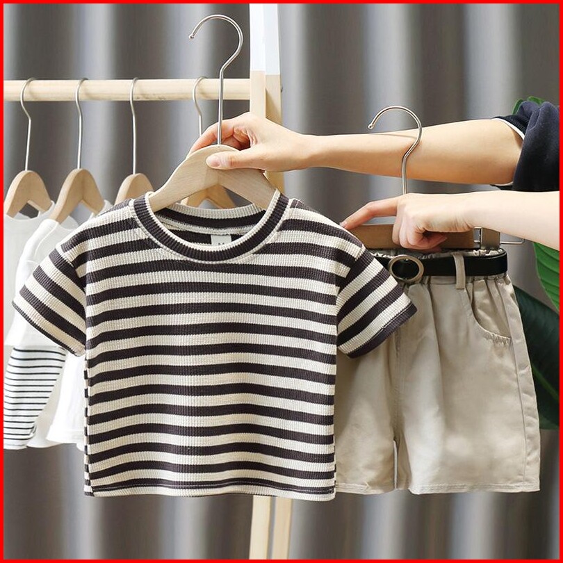 Setelan Kaos Anak Laki Laki 3pcs Impor Motif Garis Celana Pendek Termasuk Belt Import Fashion