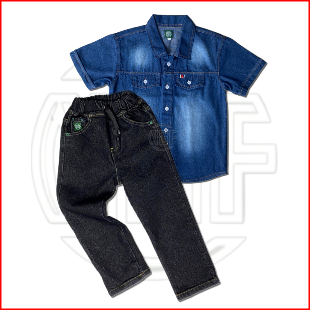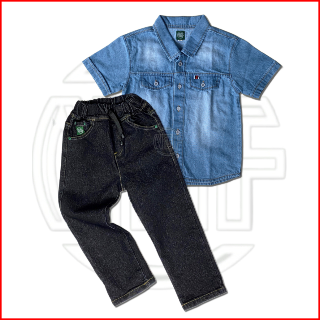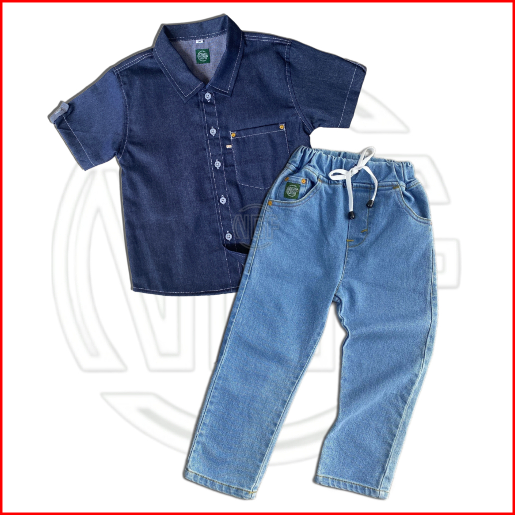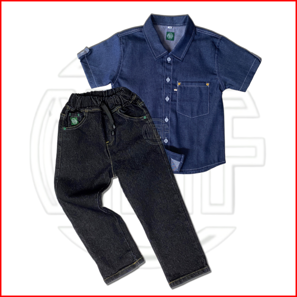 Setelan Anak Kemeja Jeans Celana Denim Stretch Adem Laki Laki 4-12 Tahun Premium M L Xl Xxl
